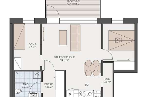 Entre med skyvedørsgarderobe. Lys stue med store vindusflater og god plass til møblering. Fin kjøkkenløsning skjermet fra stue. Romslig bad med dusjhjørne og opplegg for vaskemaskin og tørketrommel. To soverom beliggende i hver ende av stuen. Stor balkong mot vest.