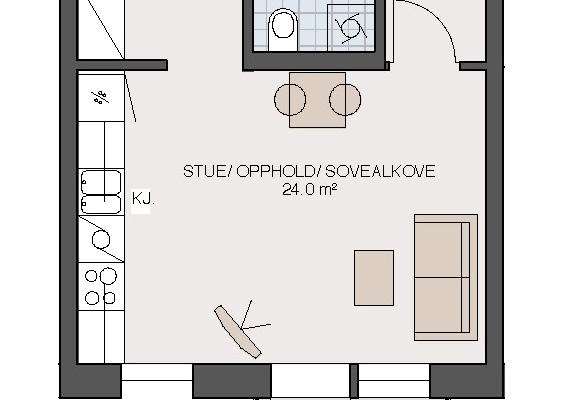 Smart 1-roms leilighet med egen sovealkove og stue med åpen kjøkkenløsning. Praktisk garderobeløsning i entre. Bad med dusj og opplegg for vaskemaskin. Terrasse/balkong med utgang fra stuen.