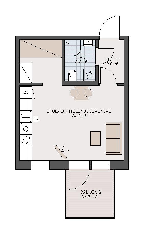 Smart 1-roms leilighet med egen sovealkove og stue med åpen kjøkkenløsning. Praktisk garderobeløsning i entre. Bad med dusj og opplegg for vaskemaskin. Terrasse/balkong med utgang fra stuen.
