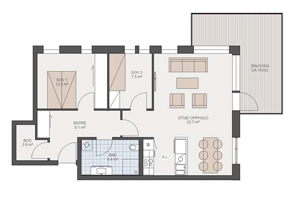 Lys hjørneleilighet med to soverom