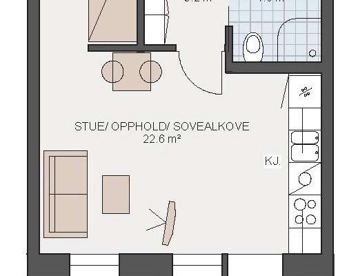 Smart 1-roms leilighet med egen sovealkove og stue med åpen kjøkkenløsning. Praktisk garderobeløsning i entre. Bad med dusj og opplegg for vaskemaskin. Terrasse/balkong med utgang fra stuen.