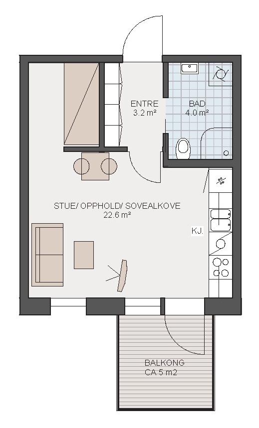 Smart 1-roms leilighet med egen sovealkove og stue med åpen kjøkkenløsning. Praktisk garderobeløsning i entre. Bad med dusj og opplegg for vaskemaskin. Terrasse/balkong med utgang fra stuen.