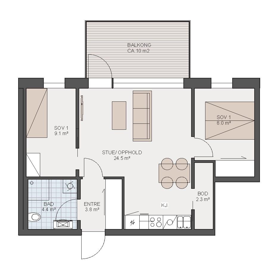 Entre med skyvedørsgarderobe. Lys stue med store vindusflater og god plass til møblering. Fin kjøkkenløsning skjermet fra stue. Romslig bad med dusjhjørne og opplegg for vaskemaskin og tørketrommel. To soverom beliggende i hver ende av stuen. Stor balkong mot vest.