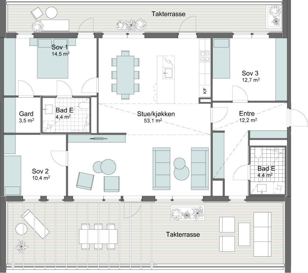 Vi bygger med 2,60 m takhøyde, store vindusflater og lys en-stavs eikeparkett. Lavt energiforbruk og godt inneklima.