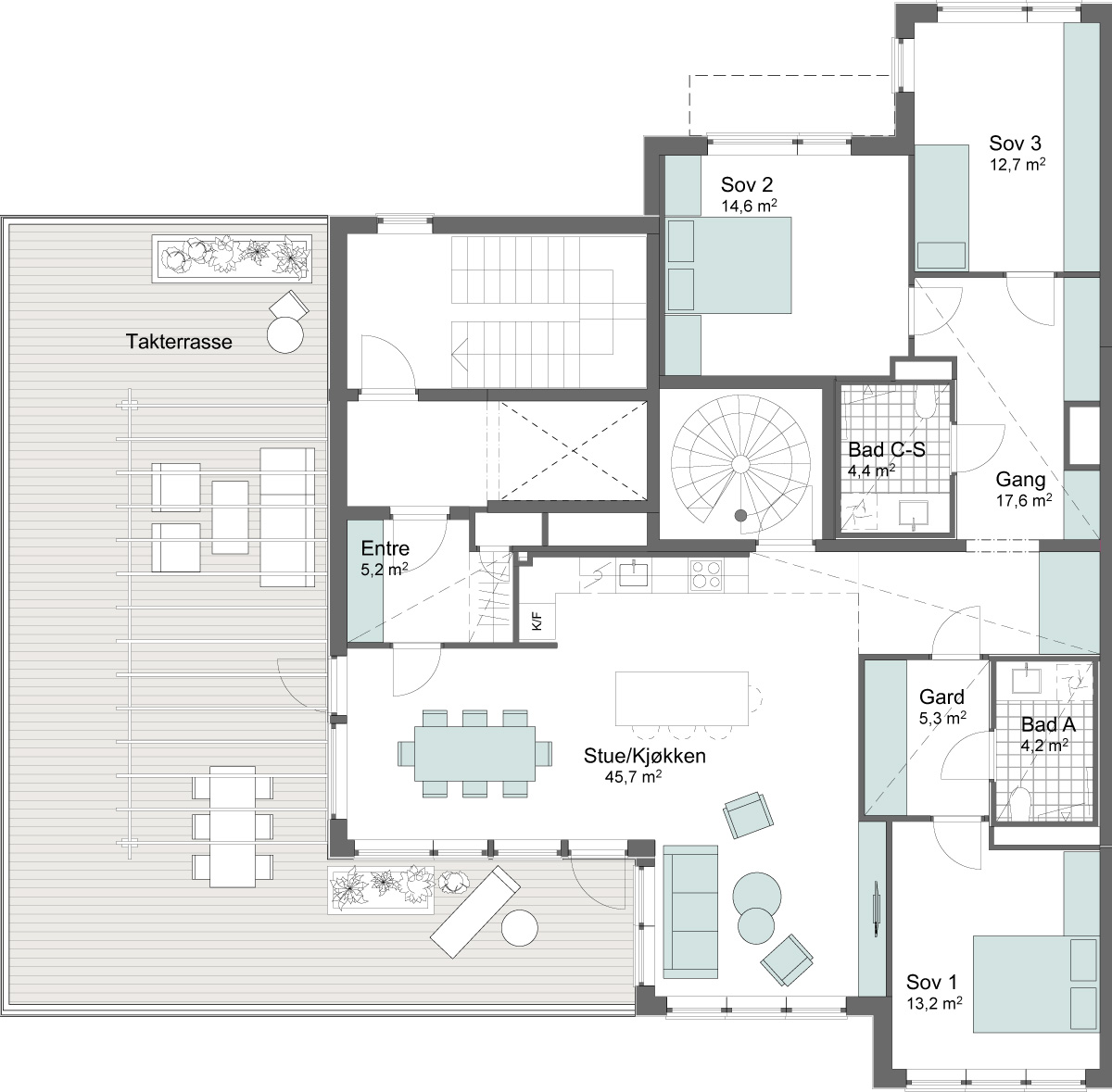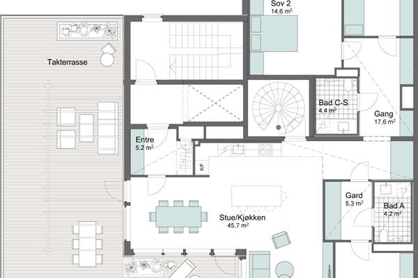 Vi bygger med 2,60 m takhøyde, store vindusflater og lys en-stavs eikeparkett. Lavt energiforbruk og godt inneklima.