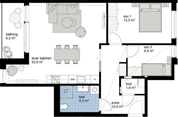Lys og luftig leilighet med 2,55 meters takhøyde, store vinduer og hvitpigmentert en-stavs herdet tregulv. Leiligheten har to soverom, åpen stue- og kjøkkenløsning med plass til både spisegruppe og sofagruppe, samt direkte tilgang til en romslig balkong. I tillegg har du tilgang til et 375 kvm stort fellesområde med kaffebar, lounge, selskapsrom, treningssenter, møterom og gjesterom for overnattingsbesøk.