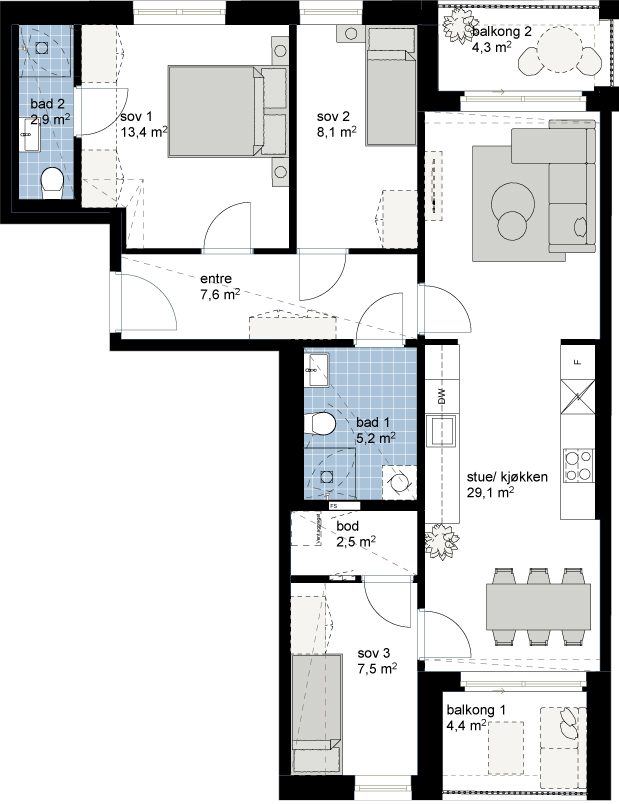 Lys og luftig leilighet med 2,70 meters takhøyde, store vinduer og hvitpigmentert en-stavs herdet tregulv. Leiligheten har en åpen stue- og kjøkkenløsning med plass til både spisegruppe og sofagruppe, samt direkte tilgang til en romslig balkong. Ved kjøp kan du kostnadsfritt velge mellom tre ulike interiørkonsepter, slik at du kan tilpasse ditt kjøkken og andre rom etter egen smak. I tillegg har du tilgang til et 375 kvm stort fellesområde med kaffebar, lounge, selskapsrom, treningssenter, møterom og gjesterom for overnattingsbesøk.