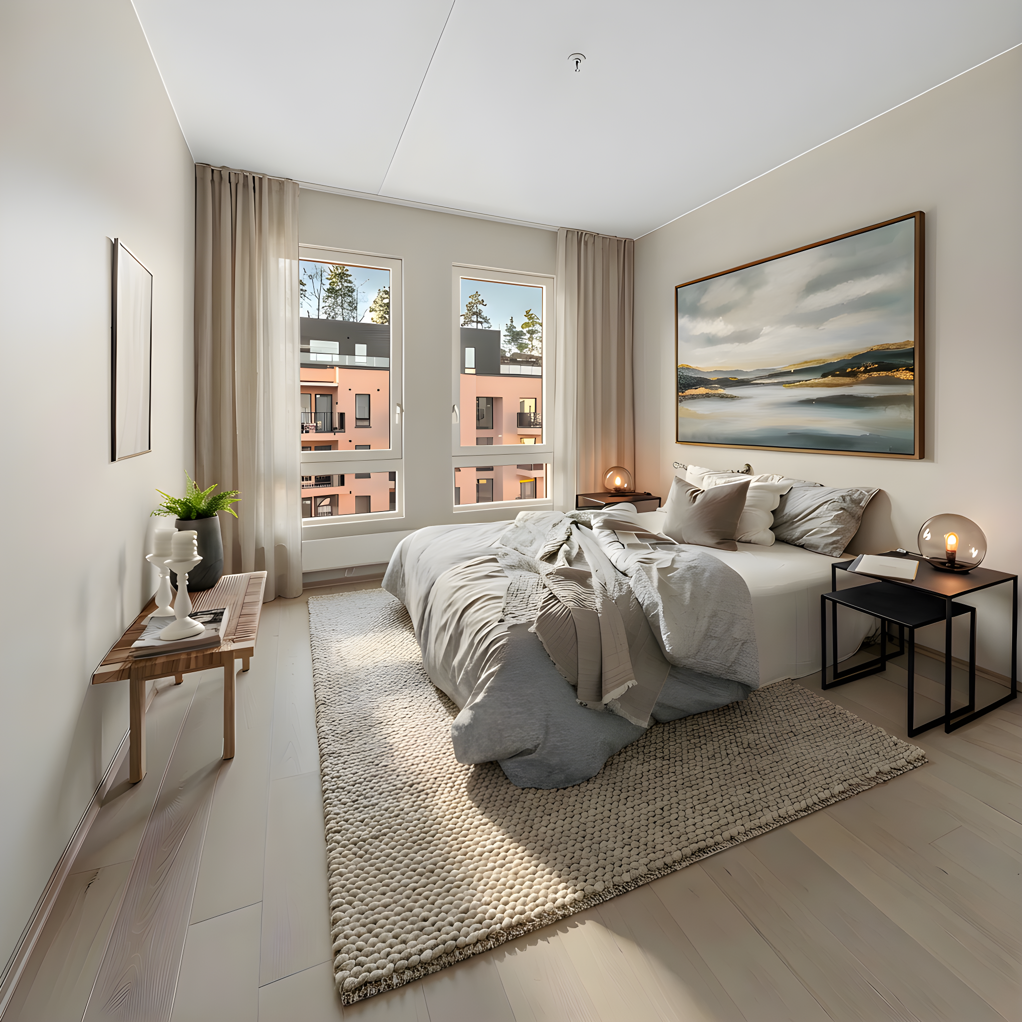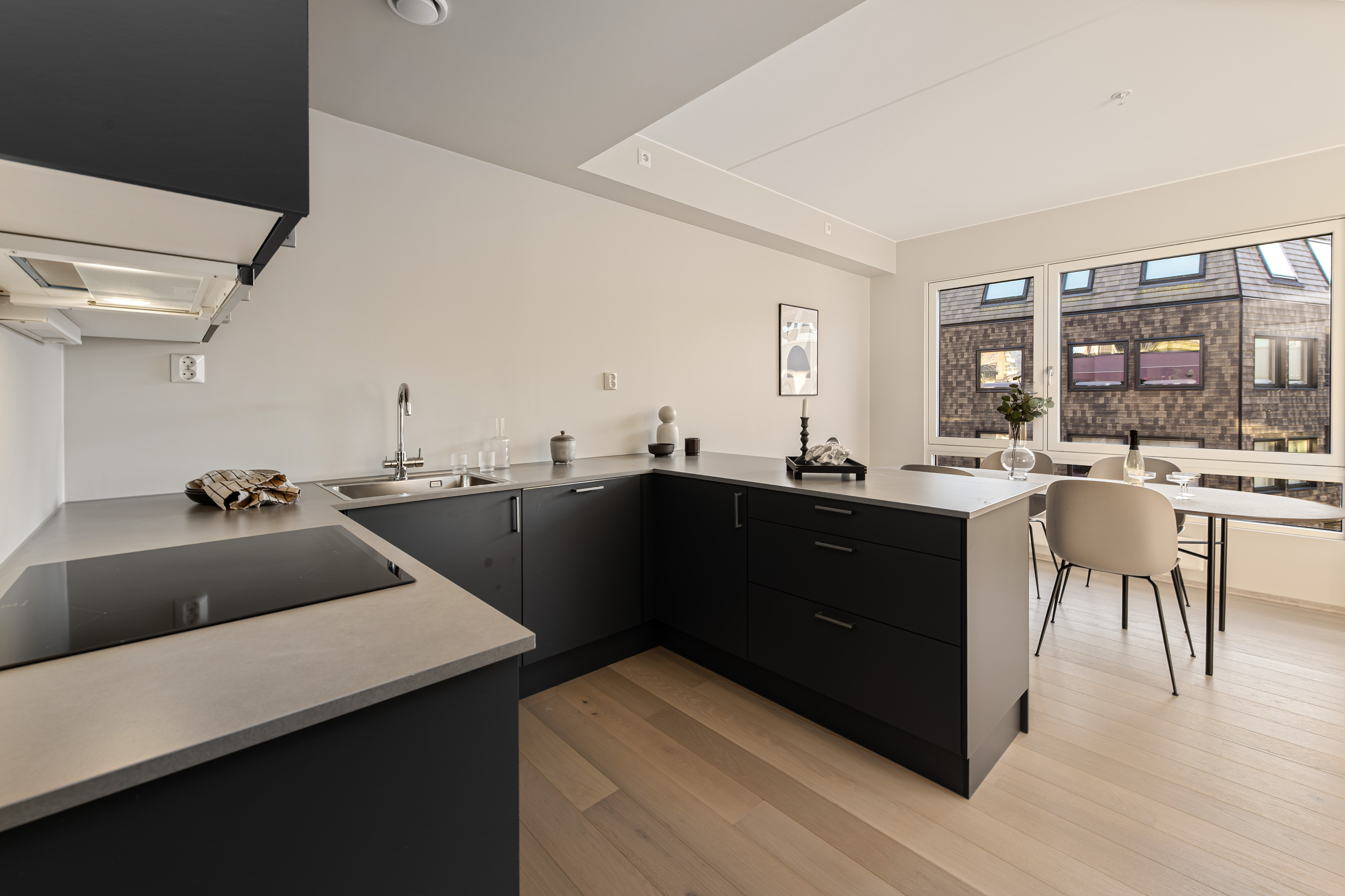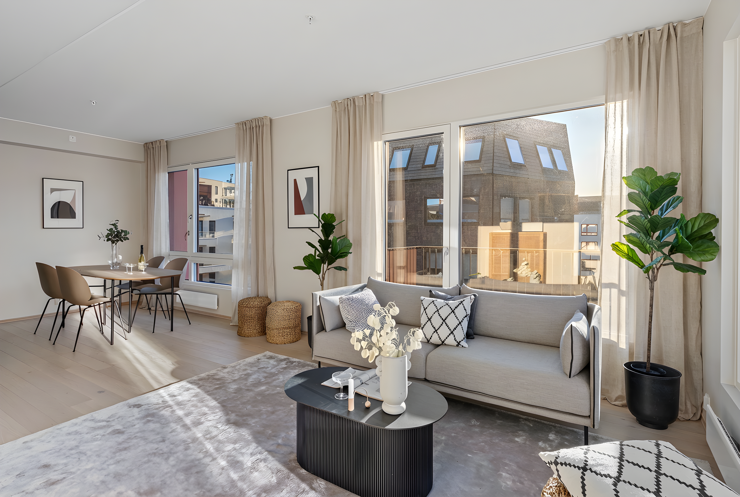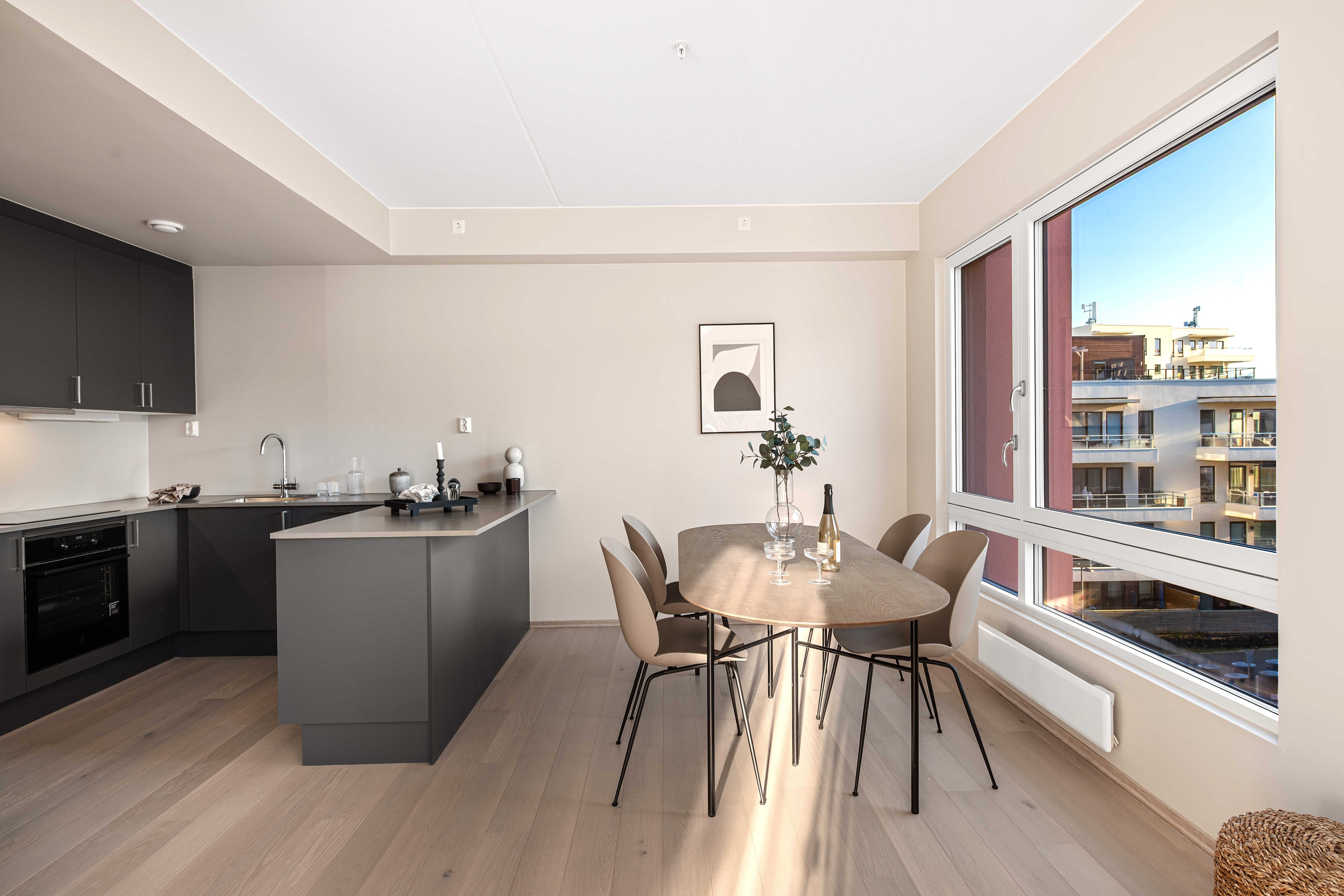 Åpen stue/kjøkkenløsning med takhøyde på 2.6 meter og store vinduer som slipper lyset inn. Pen og tidsriktig lys en-stavs eikeparkett, og lys innredning og fargedekor. Balansert ventilasjon med varmegjenvinning som sørger for godt inneklima og lave kostnader for oppvarming. Vi tilbyr nå Deleie i samarbeid med Coo til alle våre boligkjøpere. Ta kontakt med selger for mer informasjon!