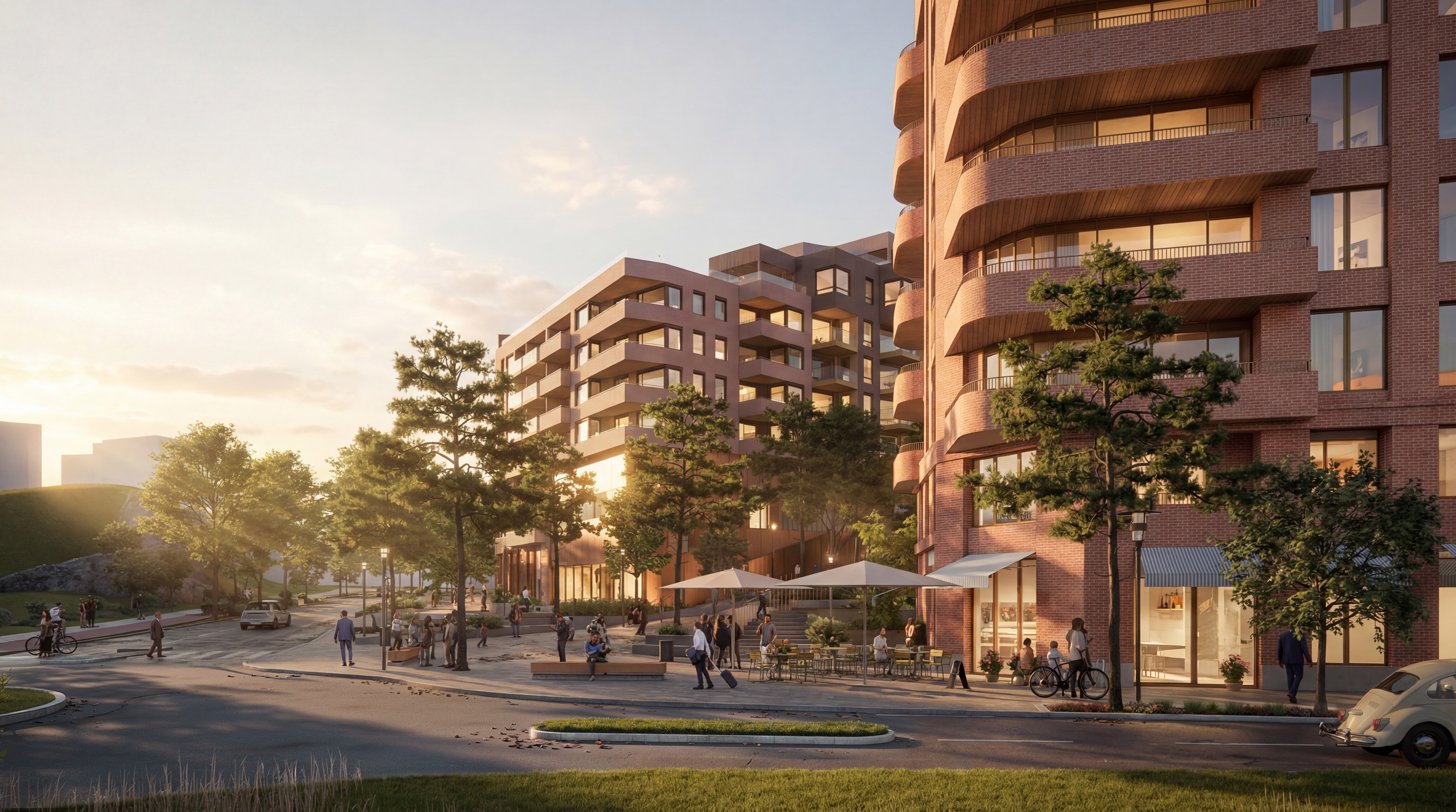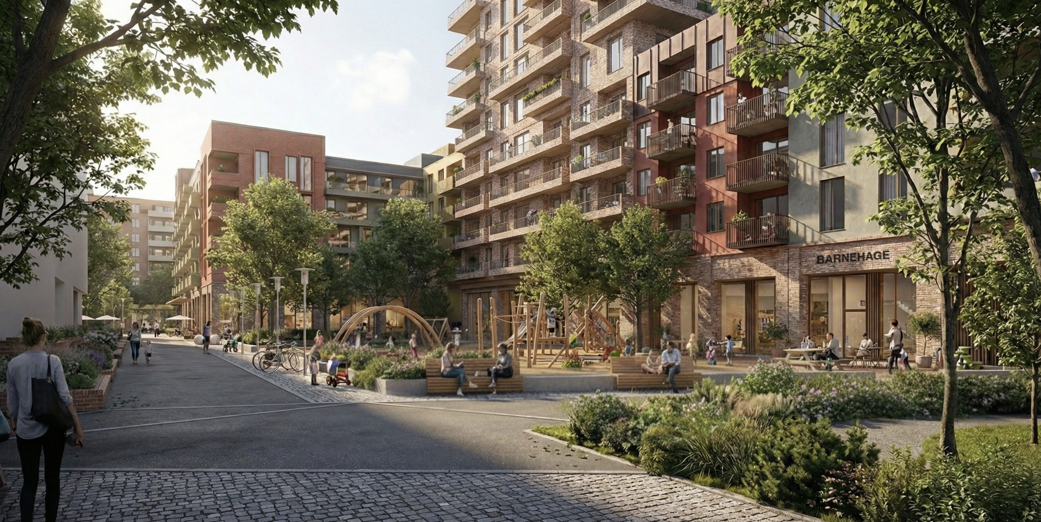 I hjertet av området kommer T-banens endestopp, omkranset av et levende sentrum med gågater, torg, sitteplasser og gårdsrom. Her møter byliv og natur hverandre i en harmonisk balanse som inviterer til bevegelse, samvær og overskudd. Vi kaller det fremtidens levende bymiljø.