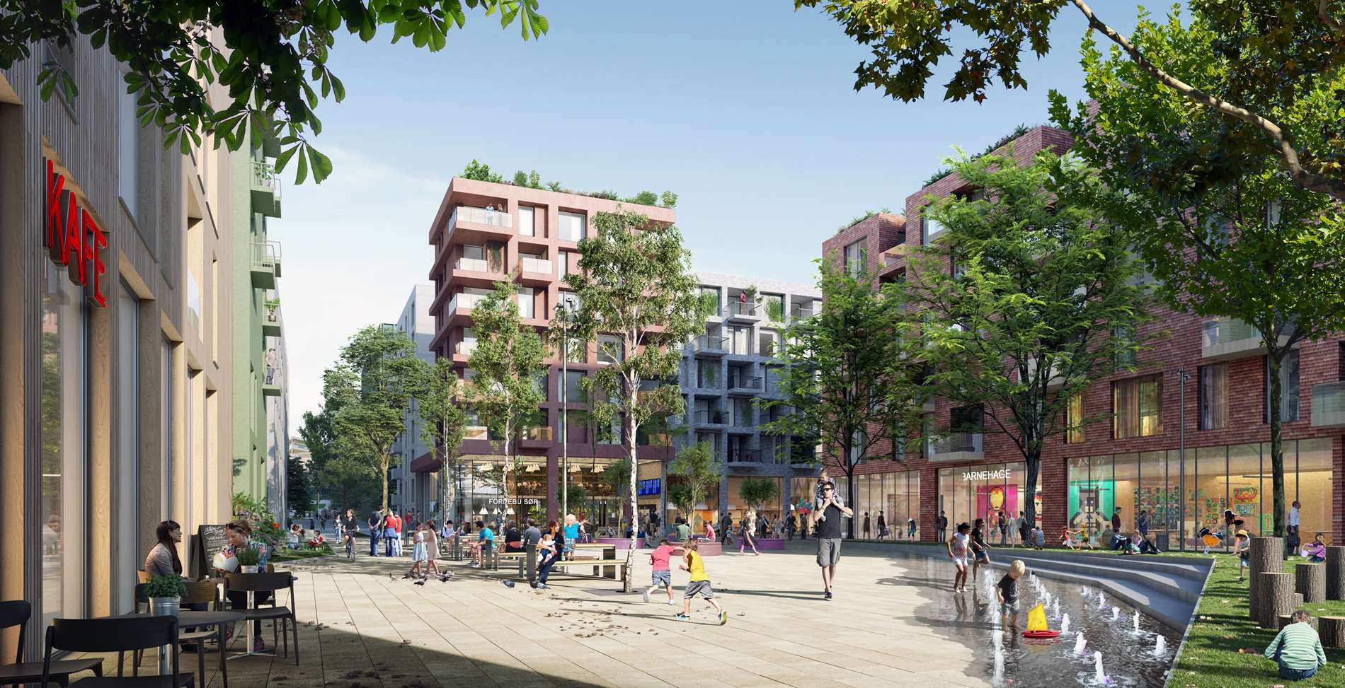 Gaten har de siste 50 årene hovedsakelig vært forbeholdt bilen og utformet på bilens premisser, men gaten og gatens funksjon i bybildet er mye eldre enn bilen. I Fornebu Sør ønsker vi å ta tilbake gatens funksjon som en møteplass og et sted hvor det er hyggelig og trygt å bevege og oppholde seg. Når bilene er borte kan gaten programmeres med smalere gang- og sykkelfelter, men også vegetasjon, benker og små lekesteder. Det vil også plutselig være attraktivt med en leilighet i første etasje med egen inngang og en liten forhage.