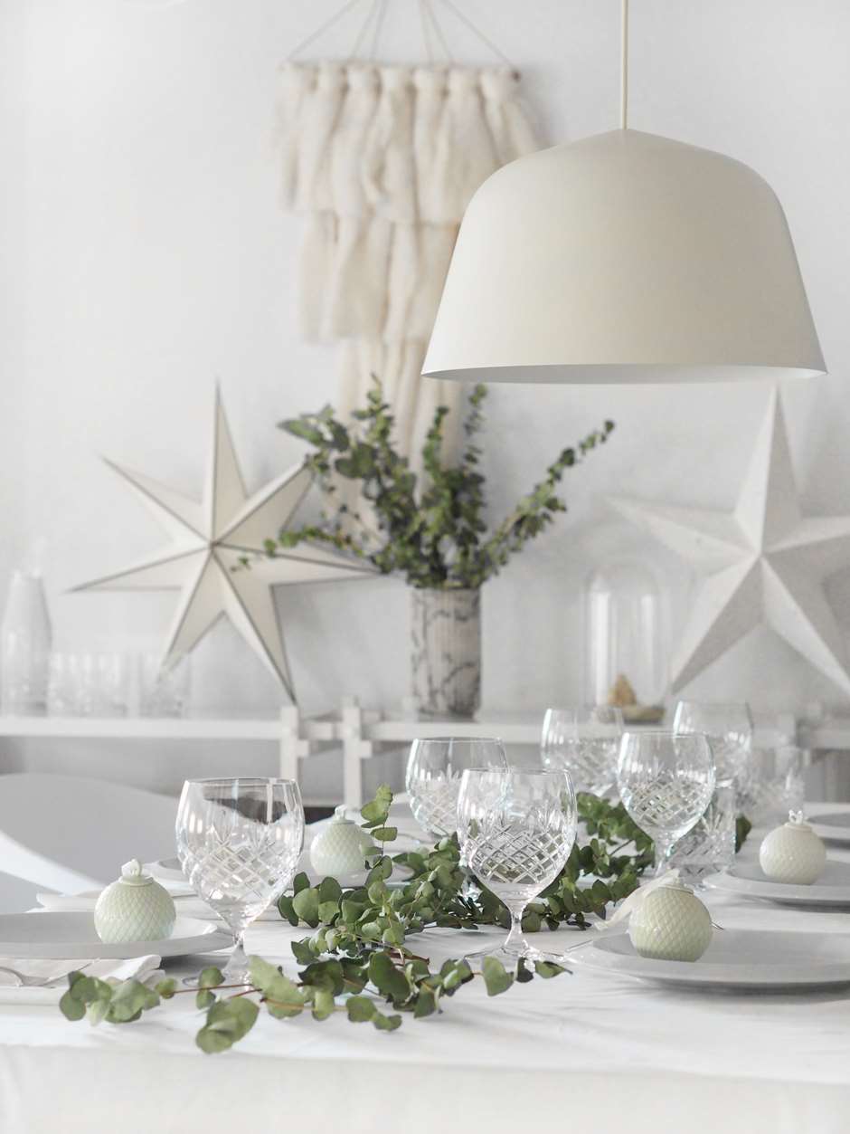 Hvitt som snø med julekuler i duse farger fra Lyngby. Tallerkenene er fra Porsgrunn. De vakre krystallglassene fra Ferderike Bagger blir blikkfanget på bordet og eukalyptusen er det lille man trenger av grønn pynt på bordet. Satengserviettene er fra Georg Jensen og de minimalistiske bestikket Grand prix er designet av Kay Bojesen