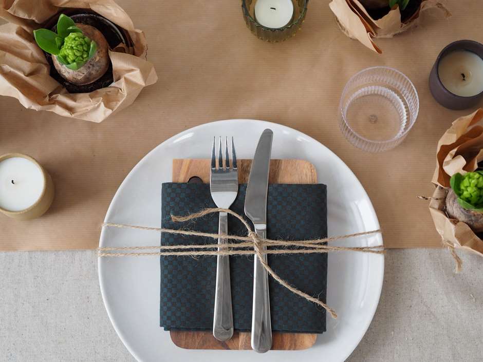 Bordet er dekket med metervare fra Stoff & Stil med en løper av gråpapir i midten. På hver tallerken er bestikket pakket inn i servietten med en et rustikt snøre. Her er vi brukt et grønt kjøkkenhåndkle fra Hay som serviett fordi det gir litt kontrast og farge til bordet, men du kan også bruke lin servietter om du har det. Glassene heter Rippel og er fra Ferm Living.