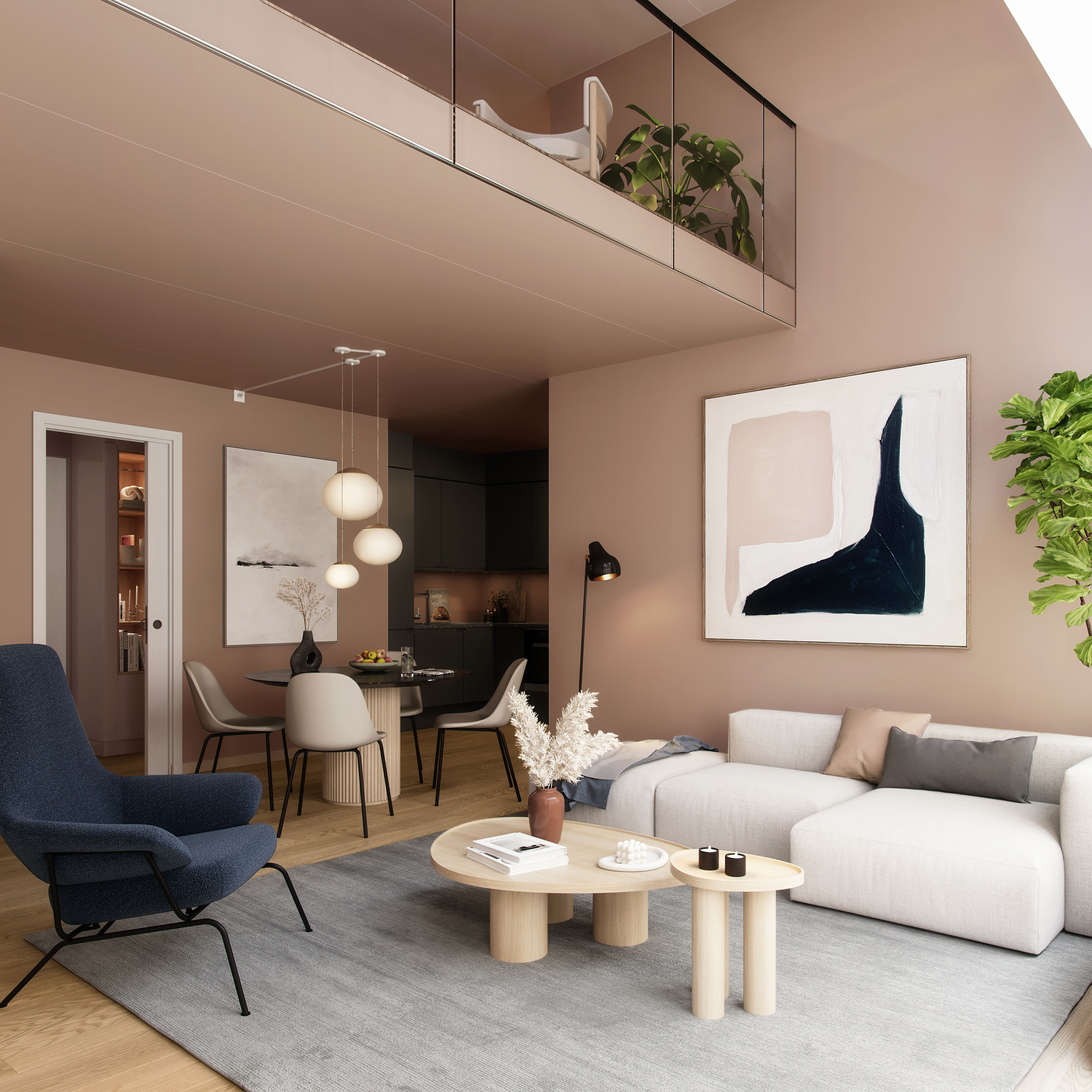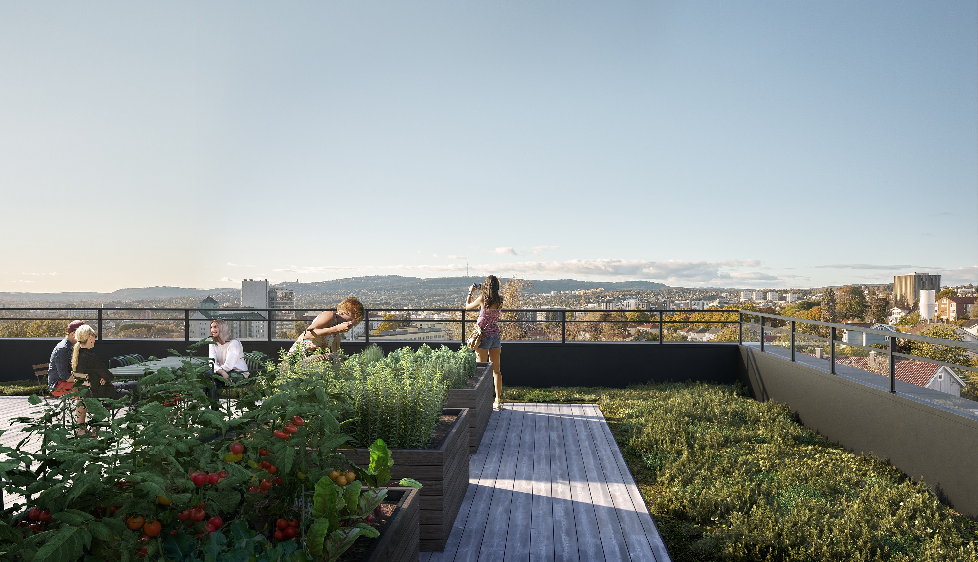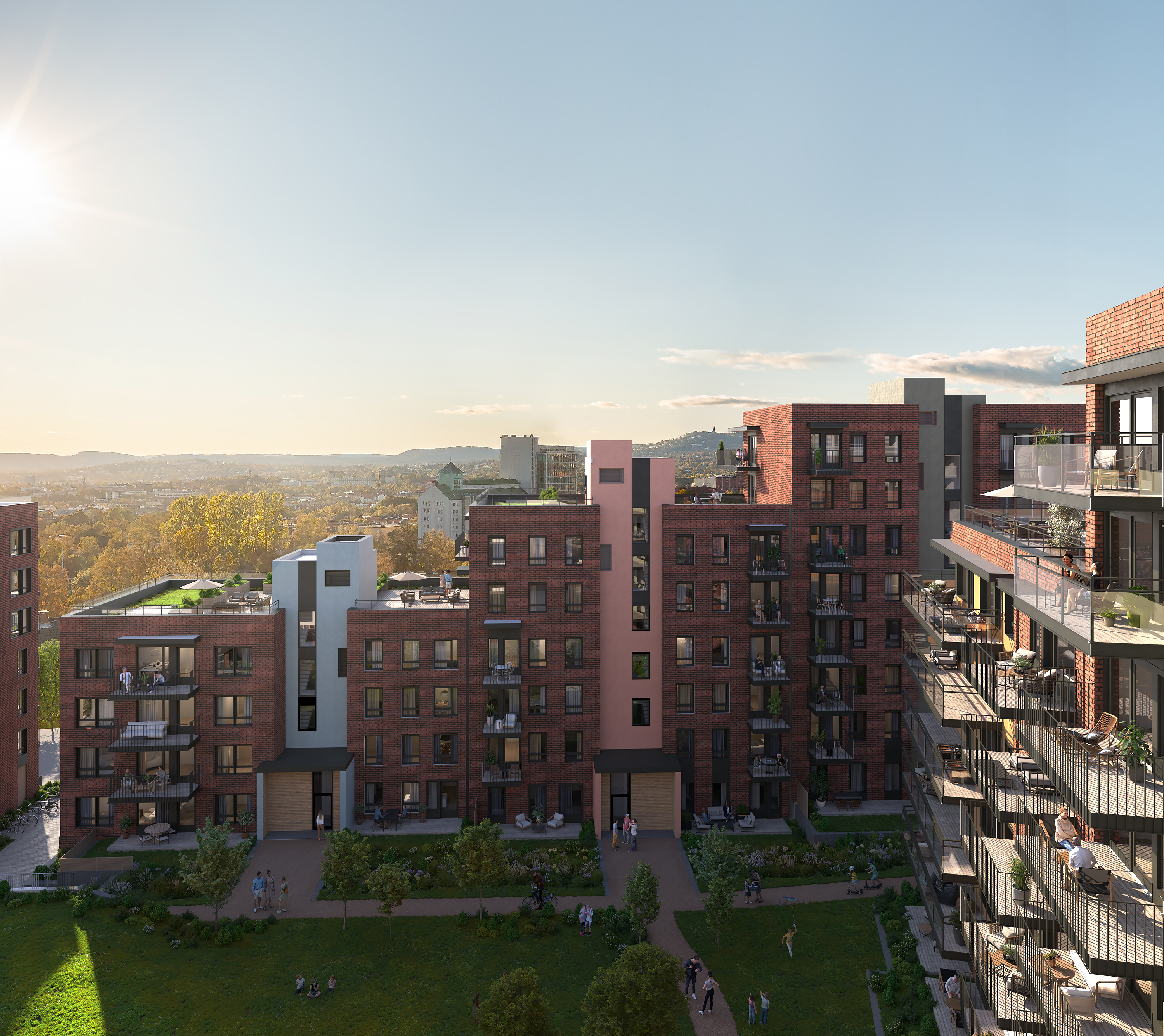 Vi bygger 355 leiligheter som får fine uteplasser, i tillegg til frodige takterrasser og fellesrom på deling. Du finner fellesområdene både ute og inne.