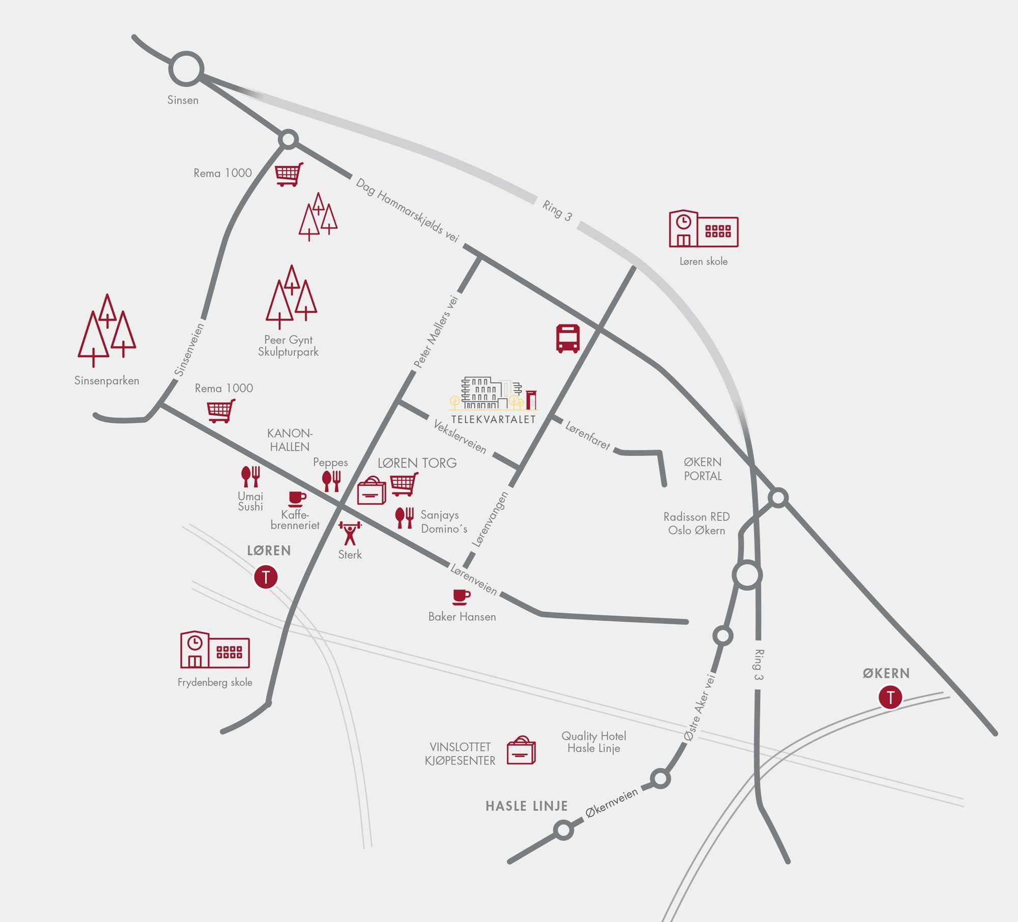 På Løren har du alt du trenger i umiddelbarhet nærhet. Det som tidligere var et industriområde og en militærleir, er nå totalt forvandlet til en helt ny bydel. Her er alt nøye planlagt for å gjøre livet så enkelt og komfortabelt som mulig for de som bor her. Skoler, barnehager og servicetilbud er i hyggelig gangavstand. Kort vei til to T-banestasjoner sørger for at du unngår kø og rush til og fra jobben. Butikker, kafeer og spisesteder gjør Løren til en egen småby du vil trives i og føle tilhørighet til.