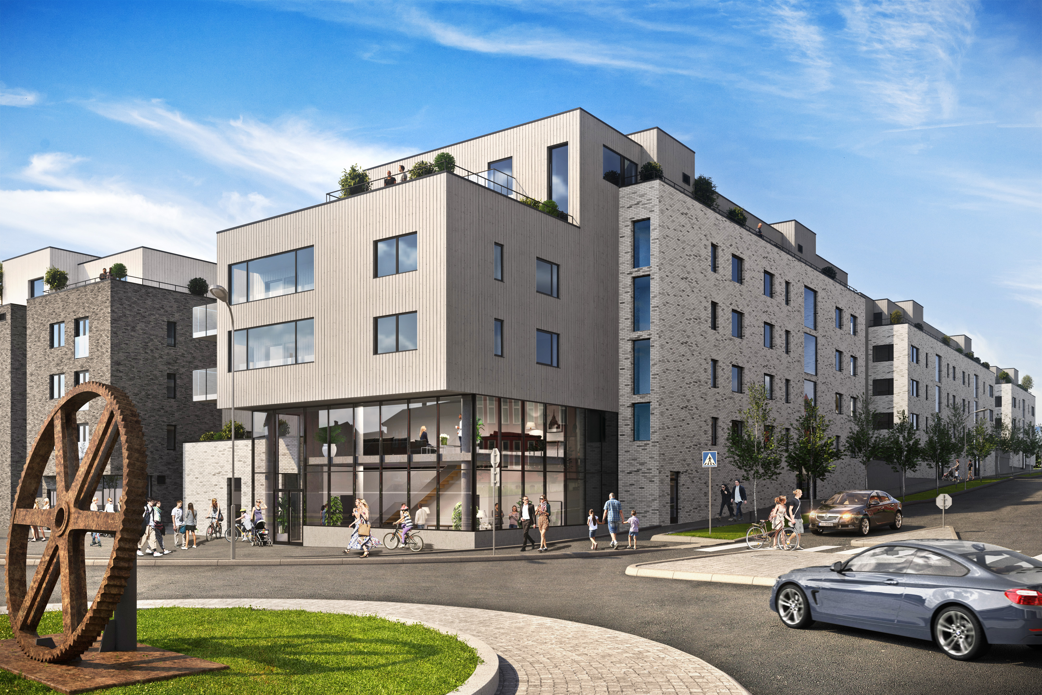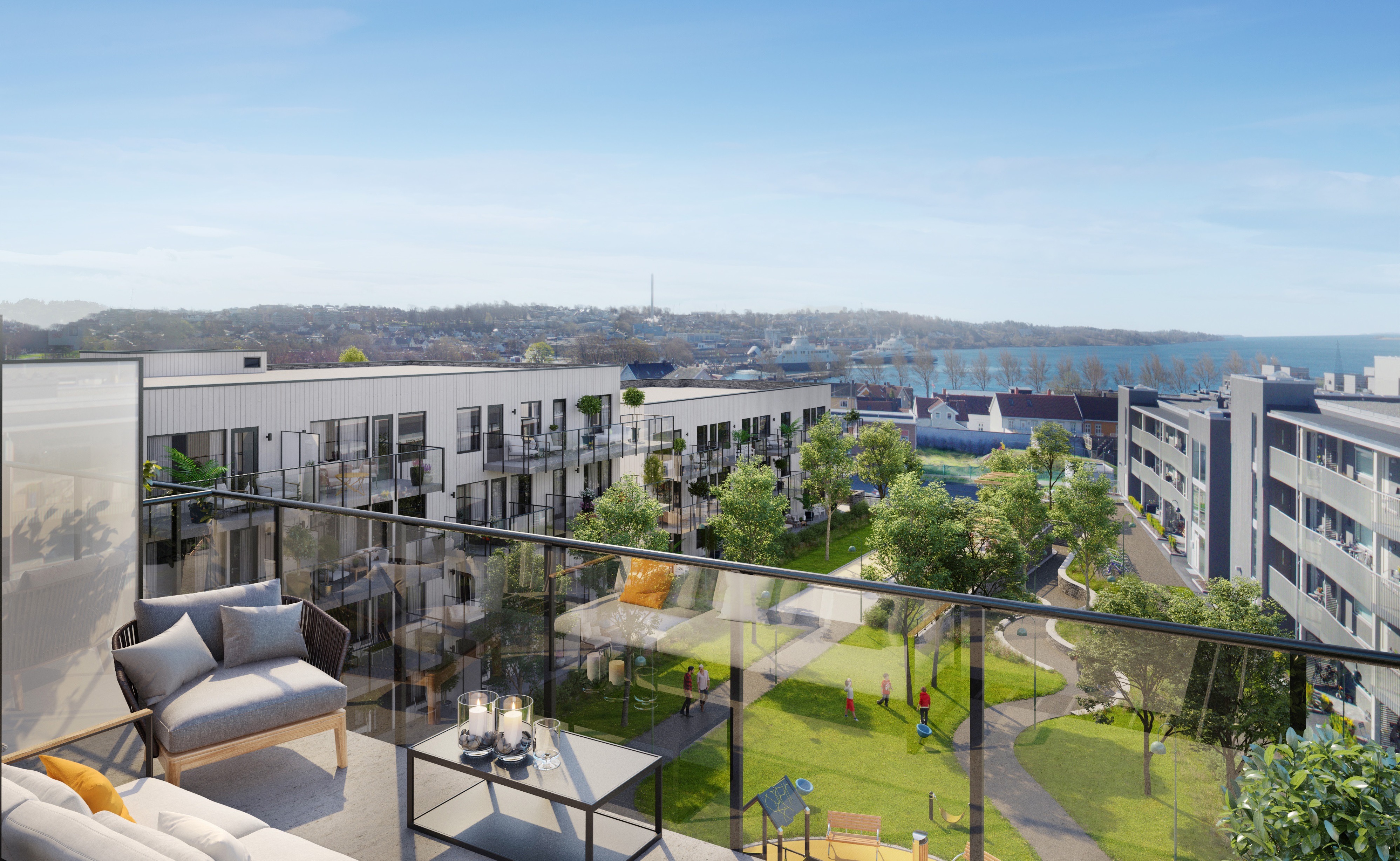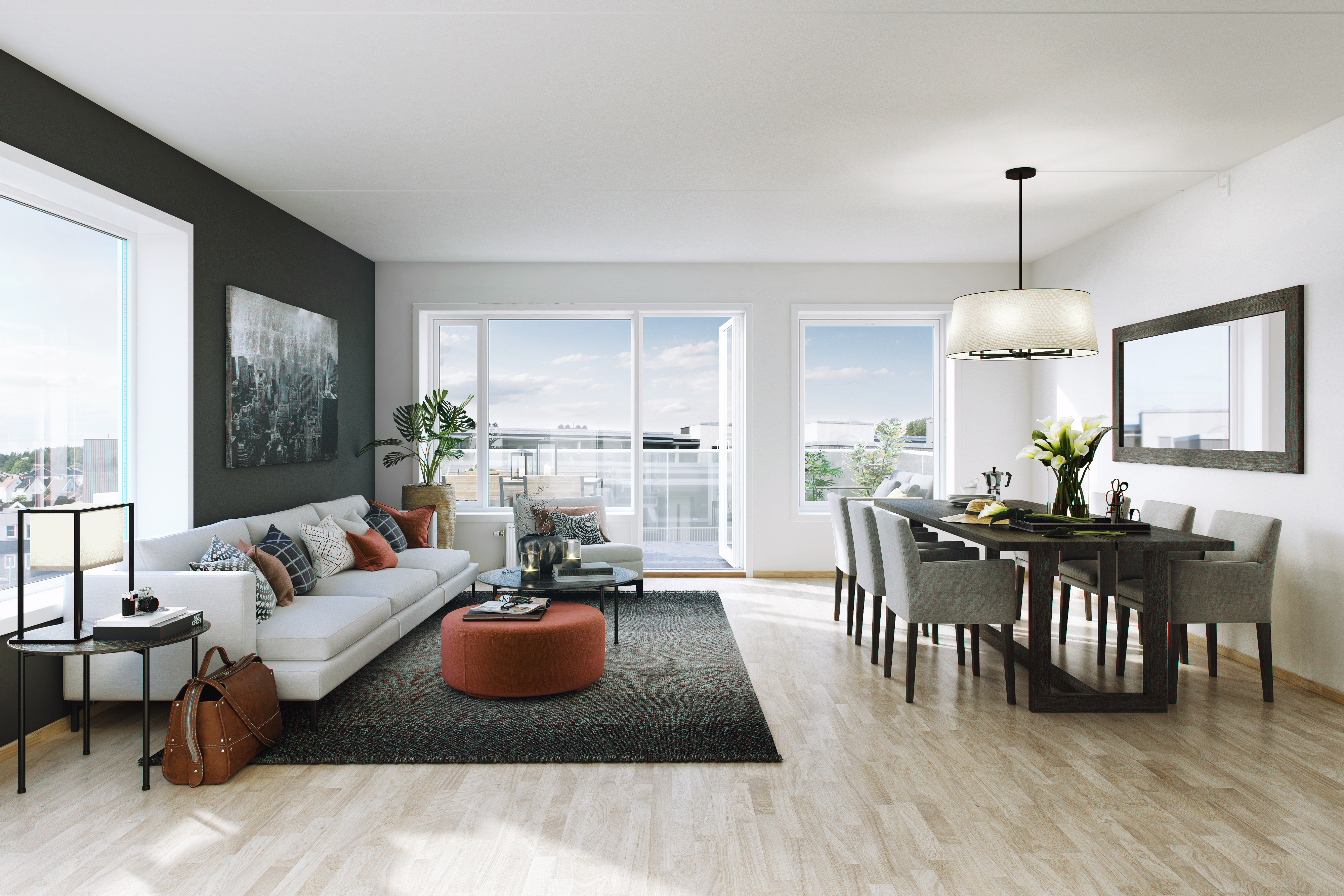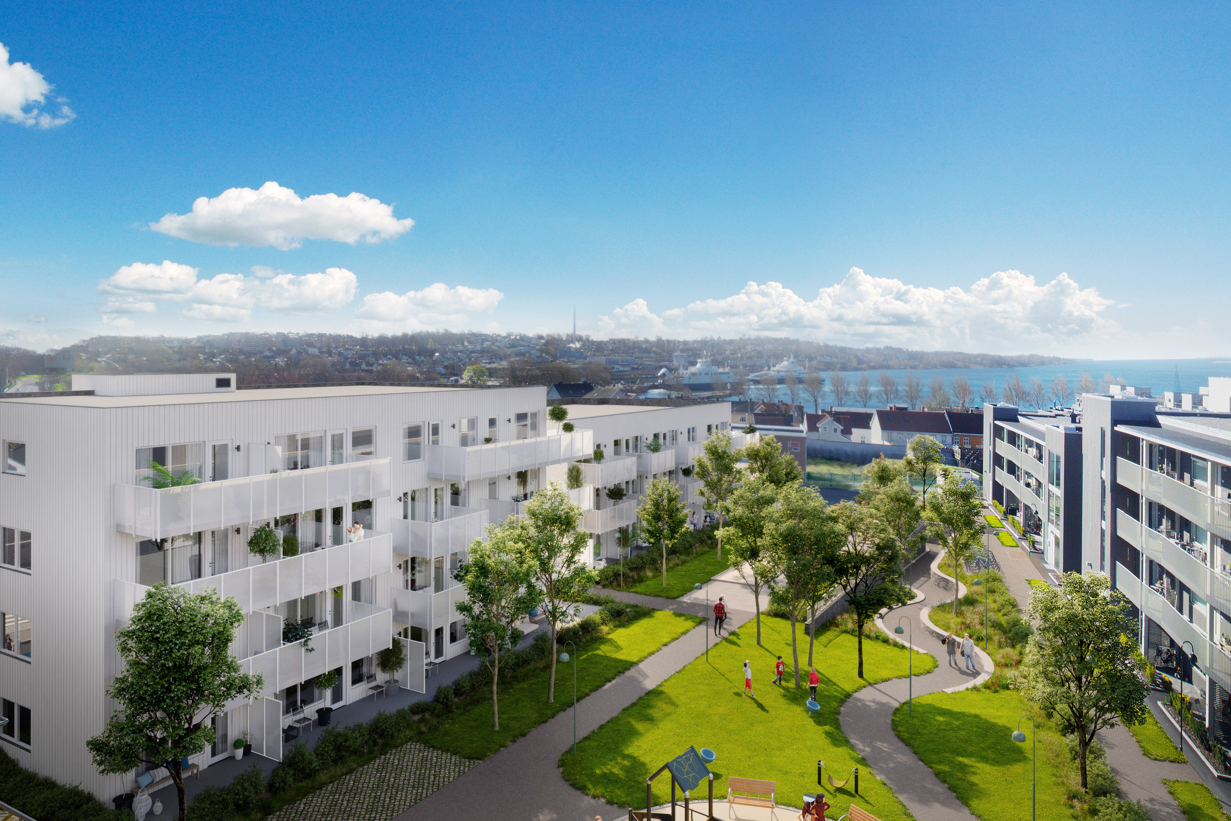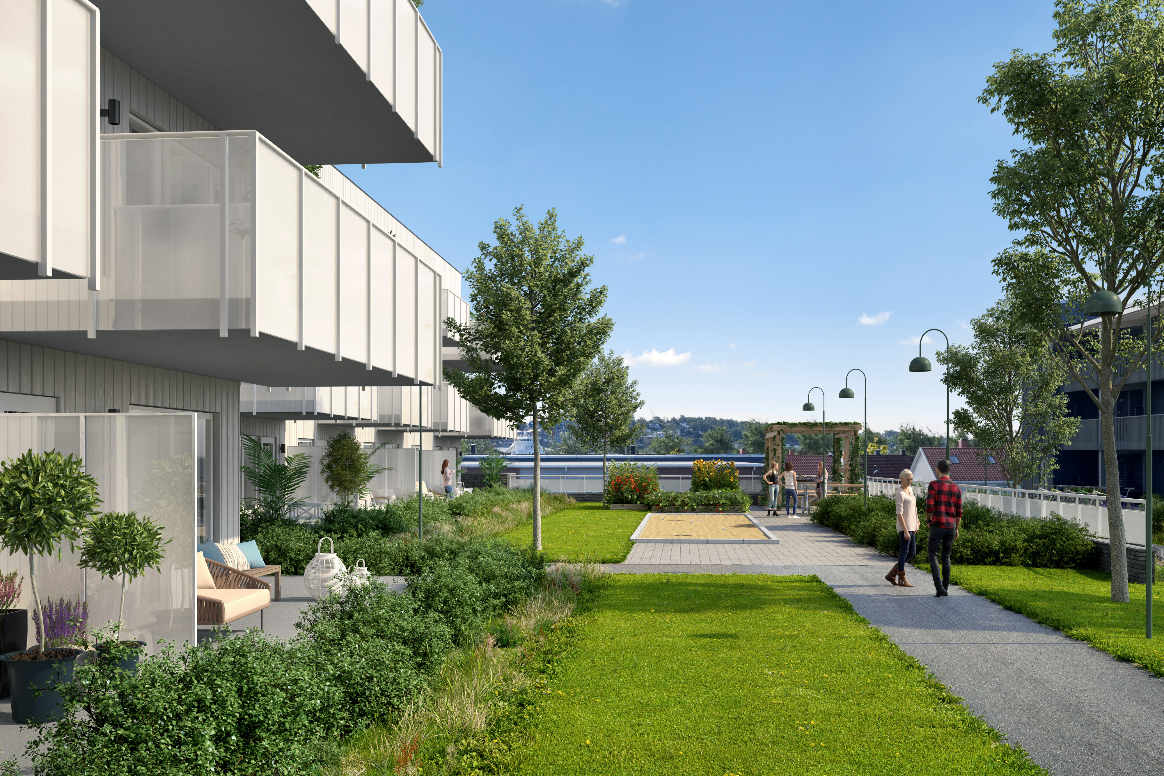 Alle illustrasjoner er utarbeidet basert på tegninger av fremtidige bygg. Illustrerte fasader vil kunne avvike fra ferdige bygg. Elementer og materialer i illustrasjonene kan avvike fra standardleveranse. Øvrige bygg, beplantning, vegetasjon og fellesarealer er ikke endelig prosjektert.