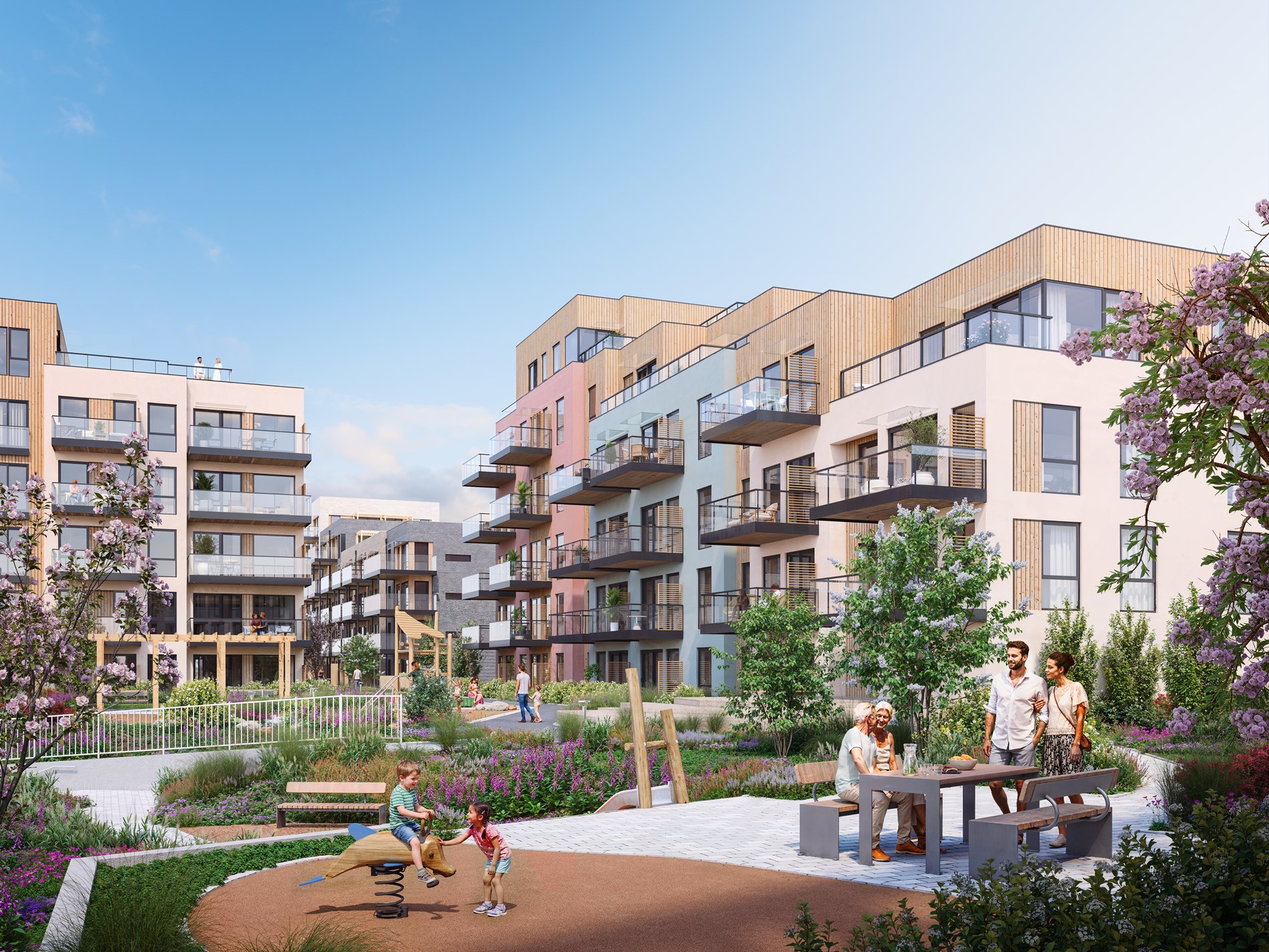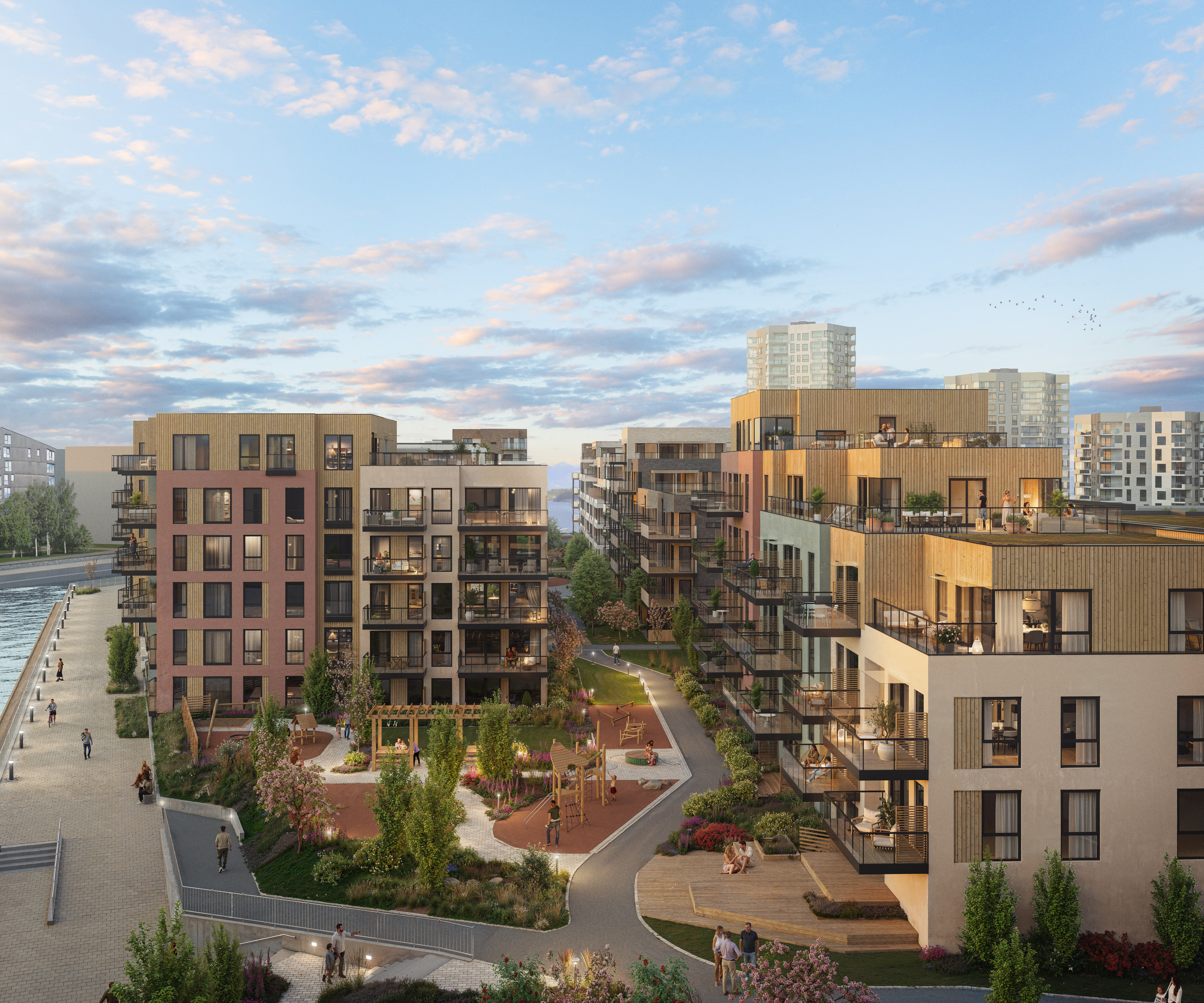 Bryggetunet består av tre bygg, utformet rundt et grønt og hyggelig tun med beplantning, sittegrupper og lekeapparater – perfekt for både små og store. Alle boligene får private uteplasser, store vindusflater og generøs takhøyde som gir en lys og luftig atmosfære.