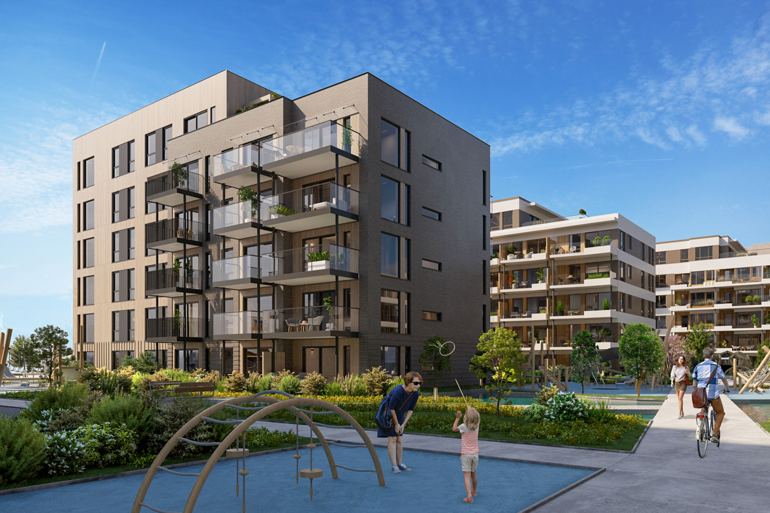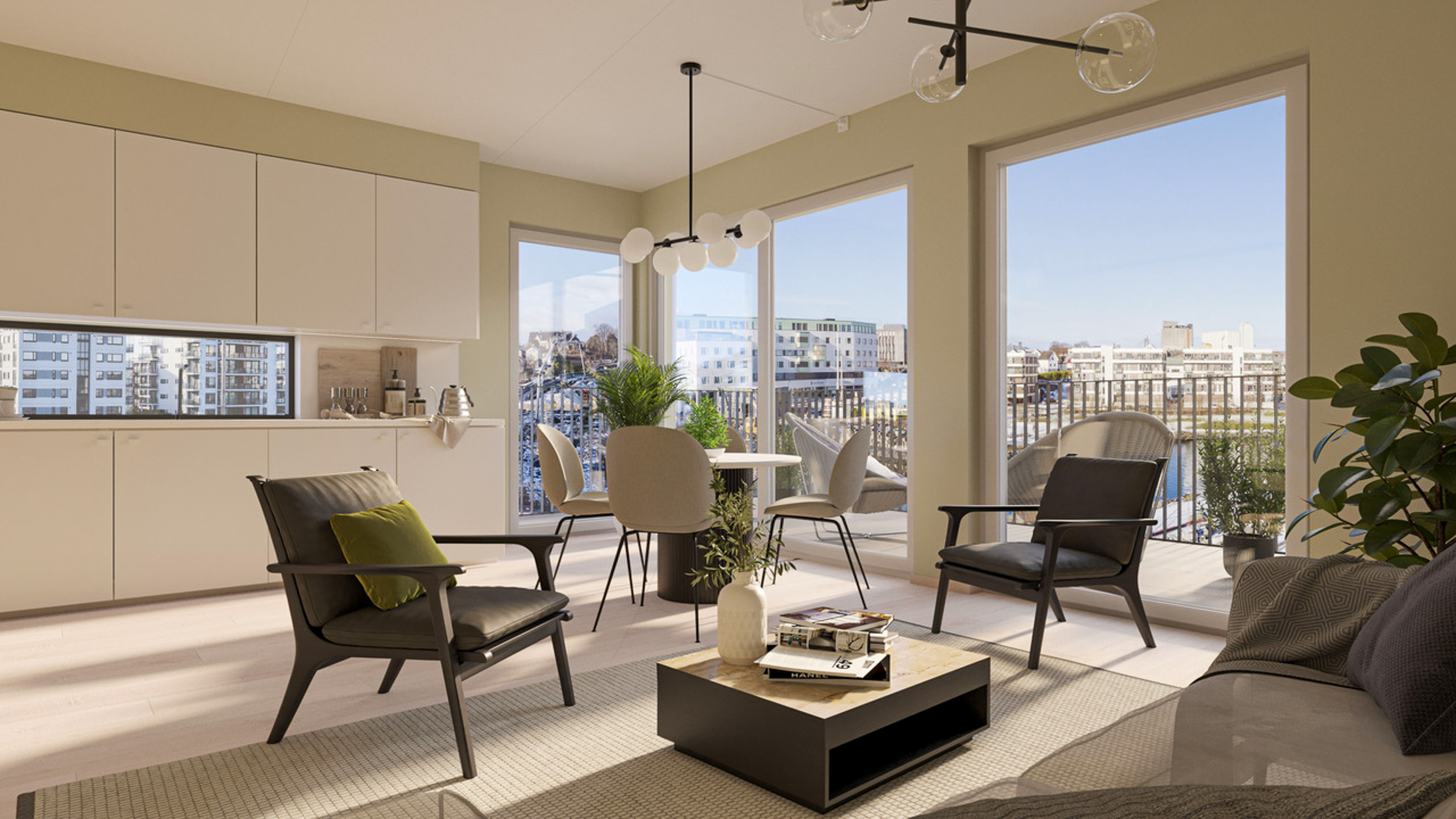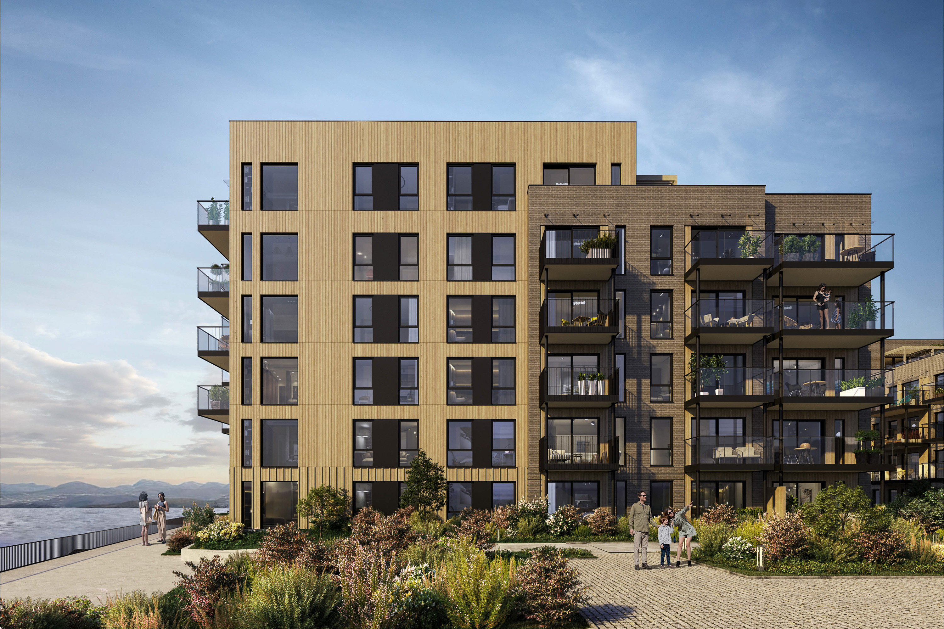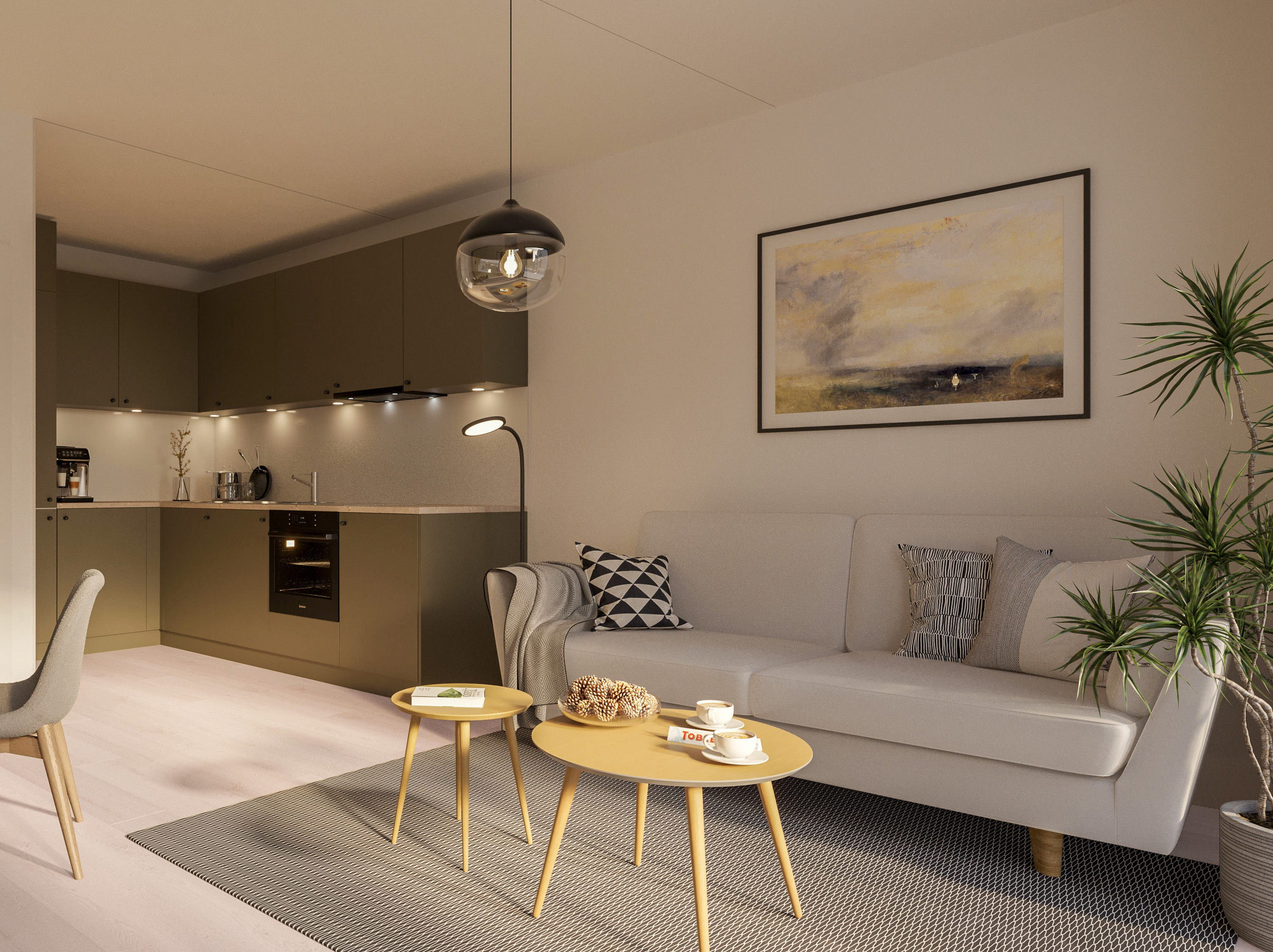 Alle illustrasjoner er utarbeidet basert på tegninger av fremtidige bygg. Illustrerte fasader vil kunne avvike fra ferdige bygg. Elementer og materialer i illustrasjonene kan avvike fra standardleveranse. Øvrige bygg, beplantning, vegetasjon og fellesarealer er ikke endelig prosjektert.