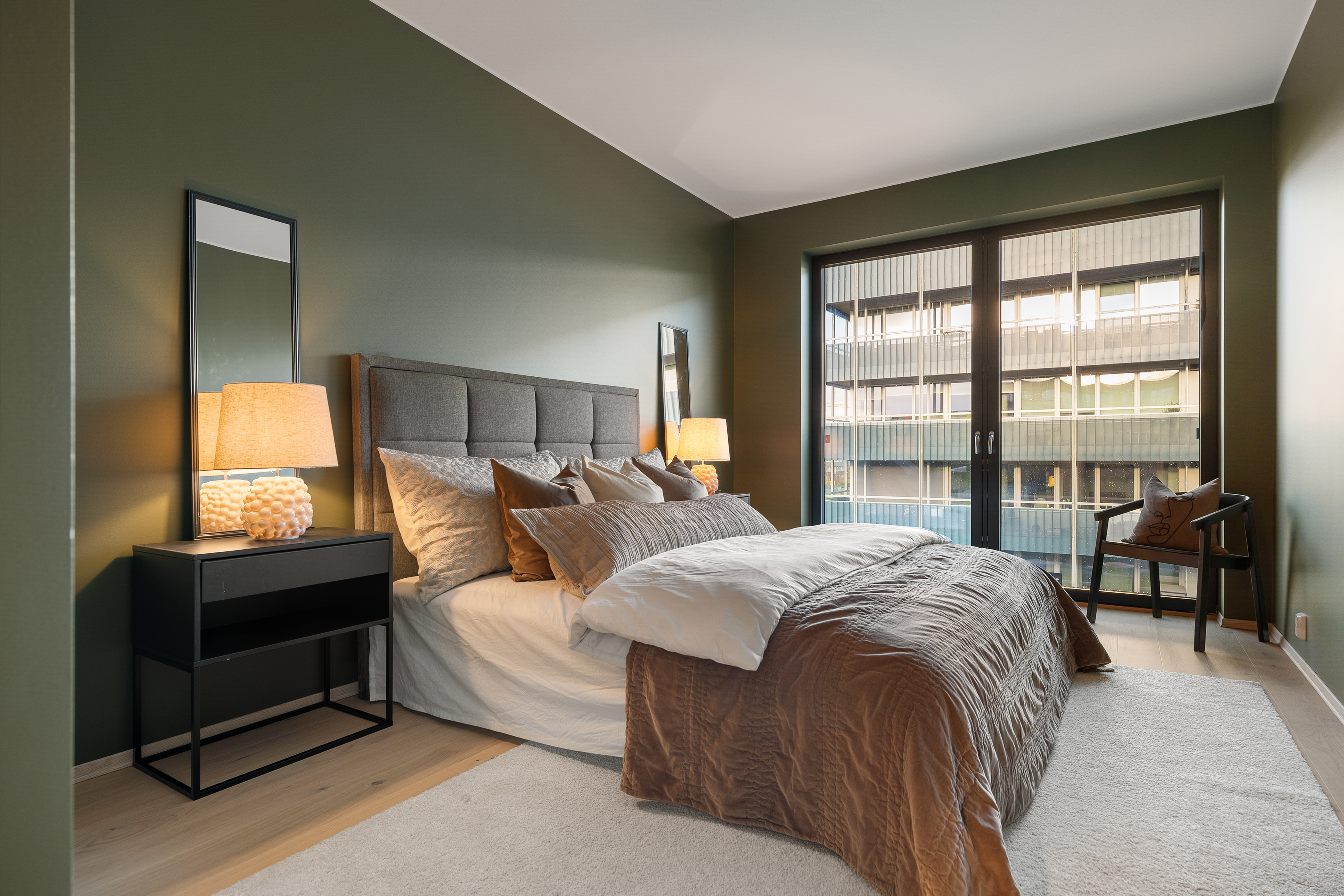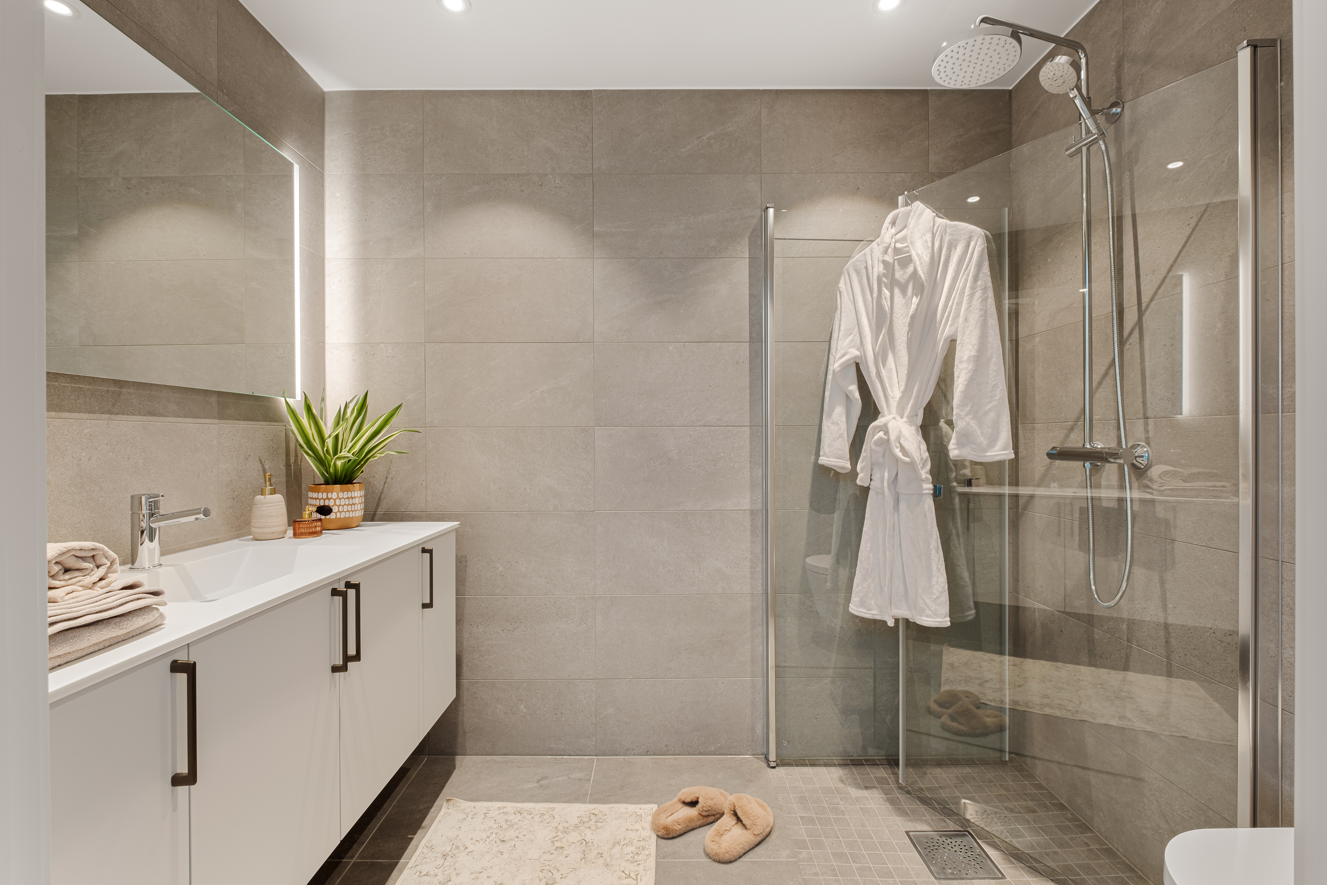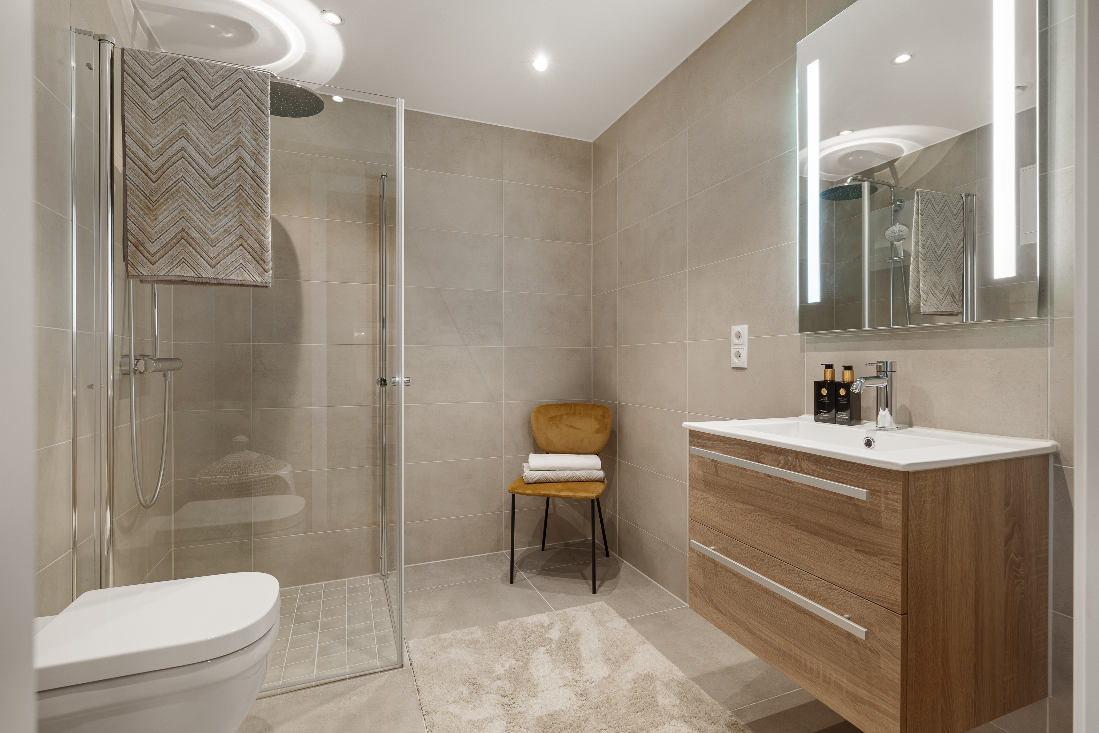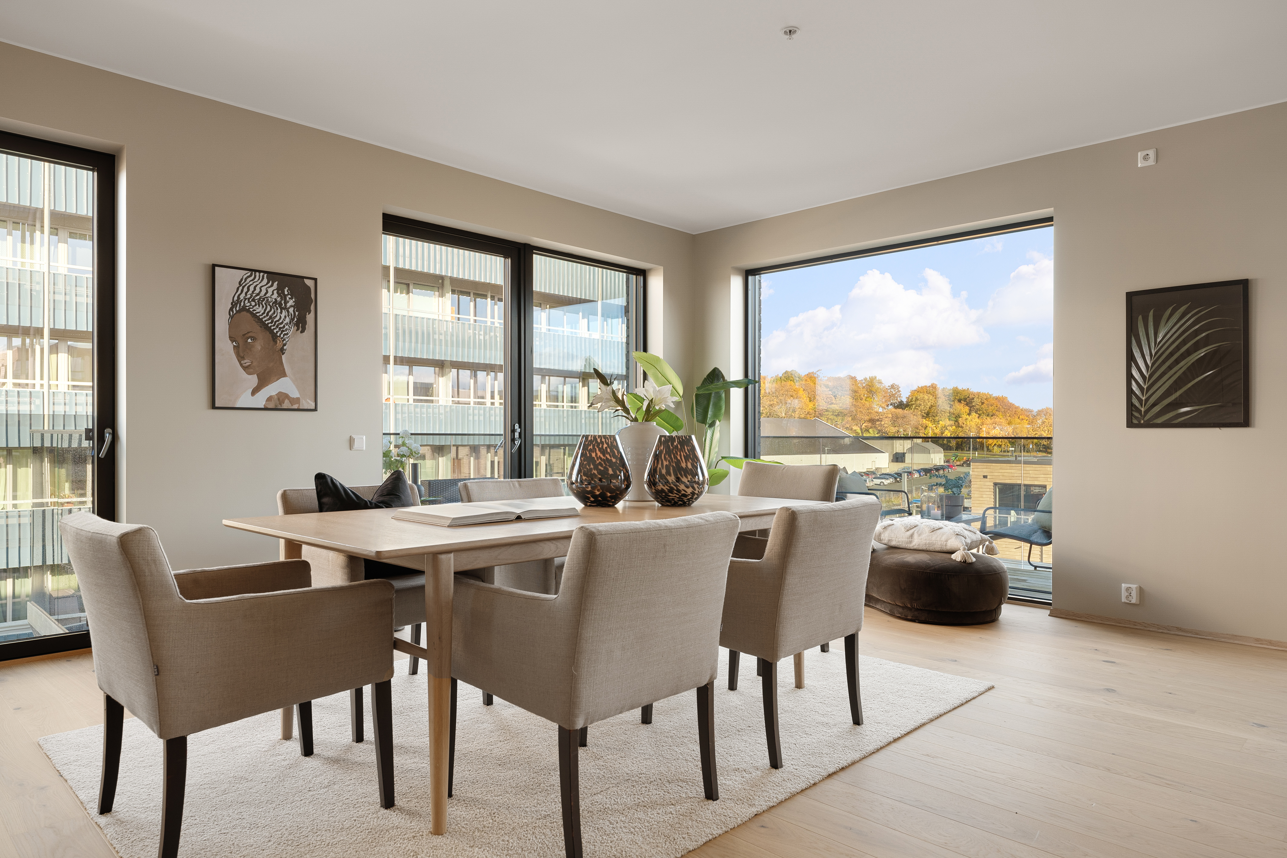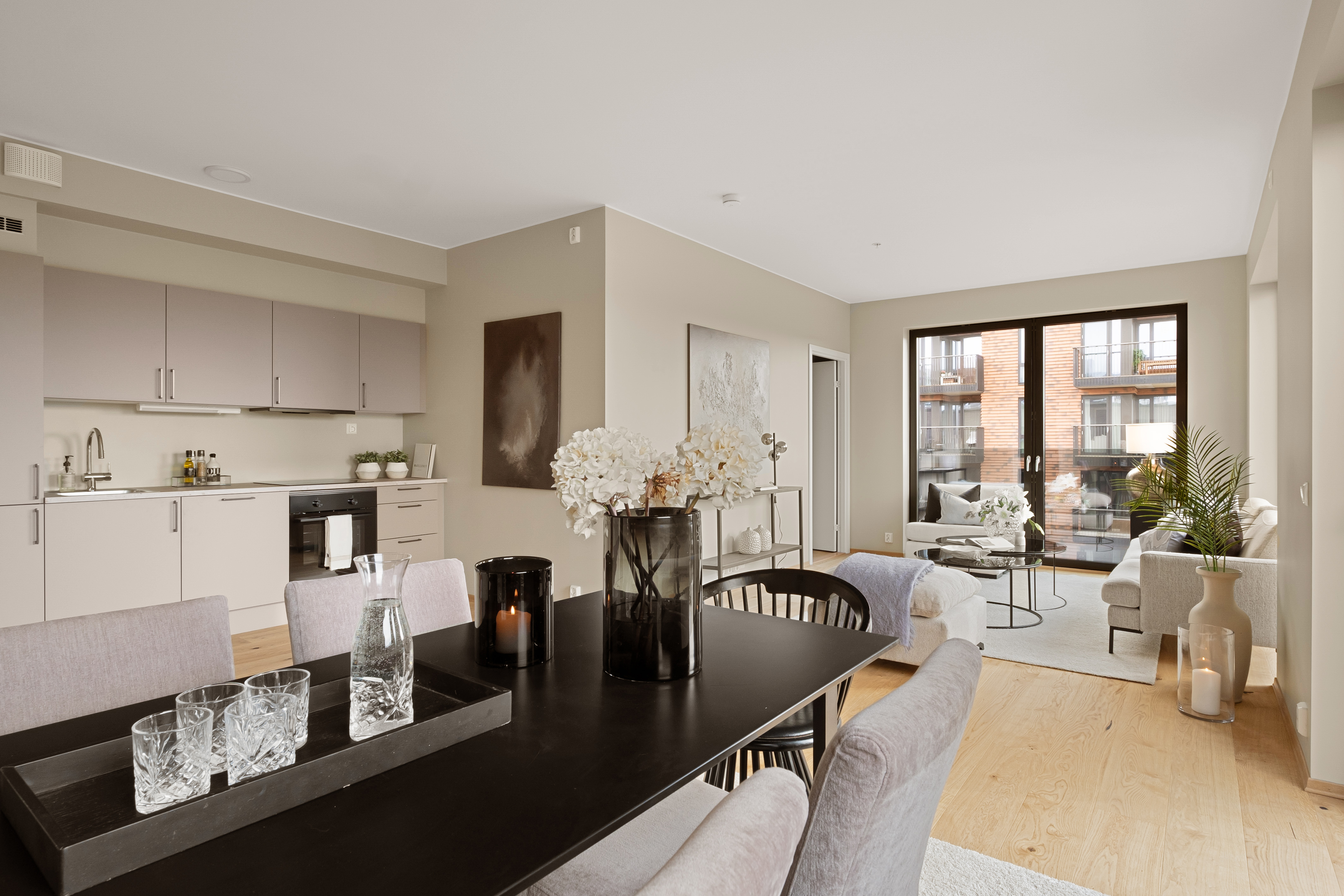 Leilighetene har lys en-stavs eikeparkett, generøs takhøyde og store vindusflater. Kjøkken er fra HTH og badene er moderne og delikate med varme i gulv.