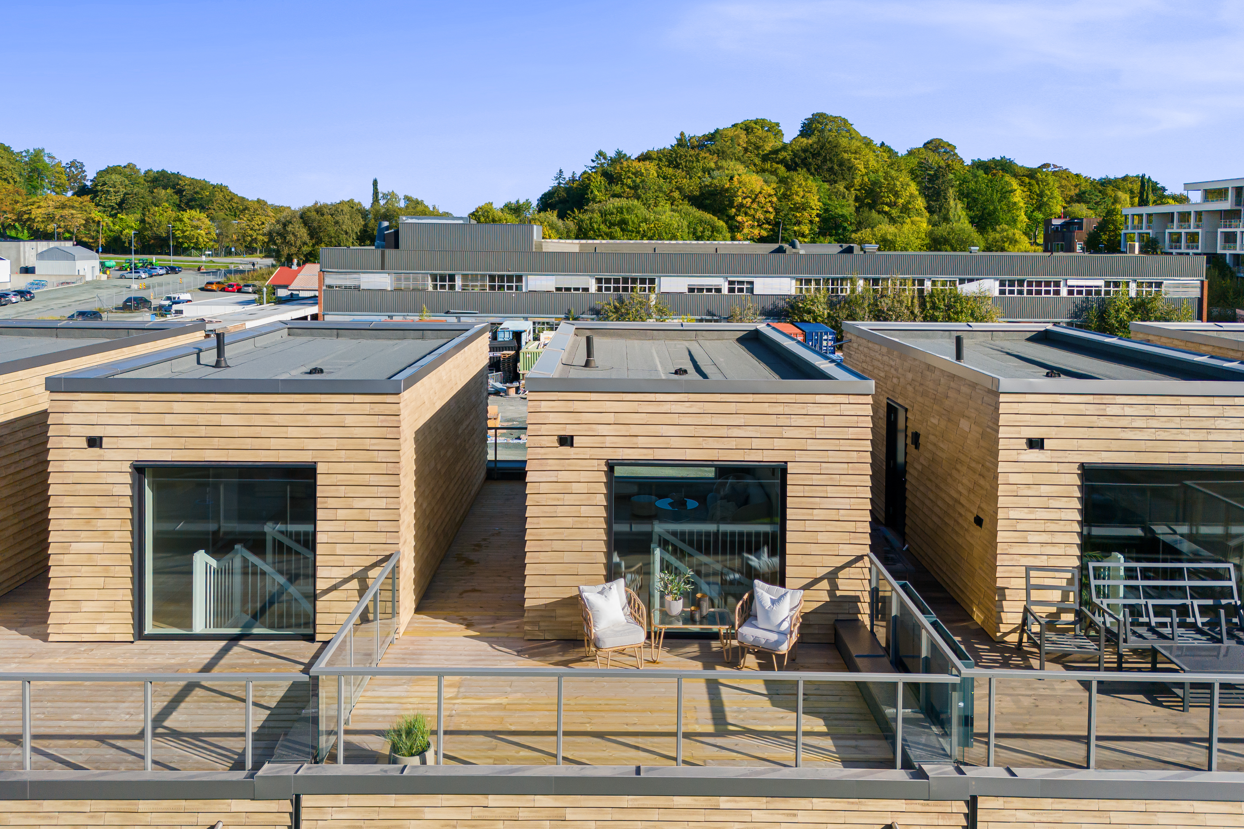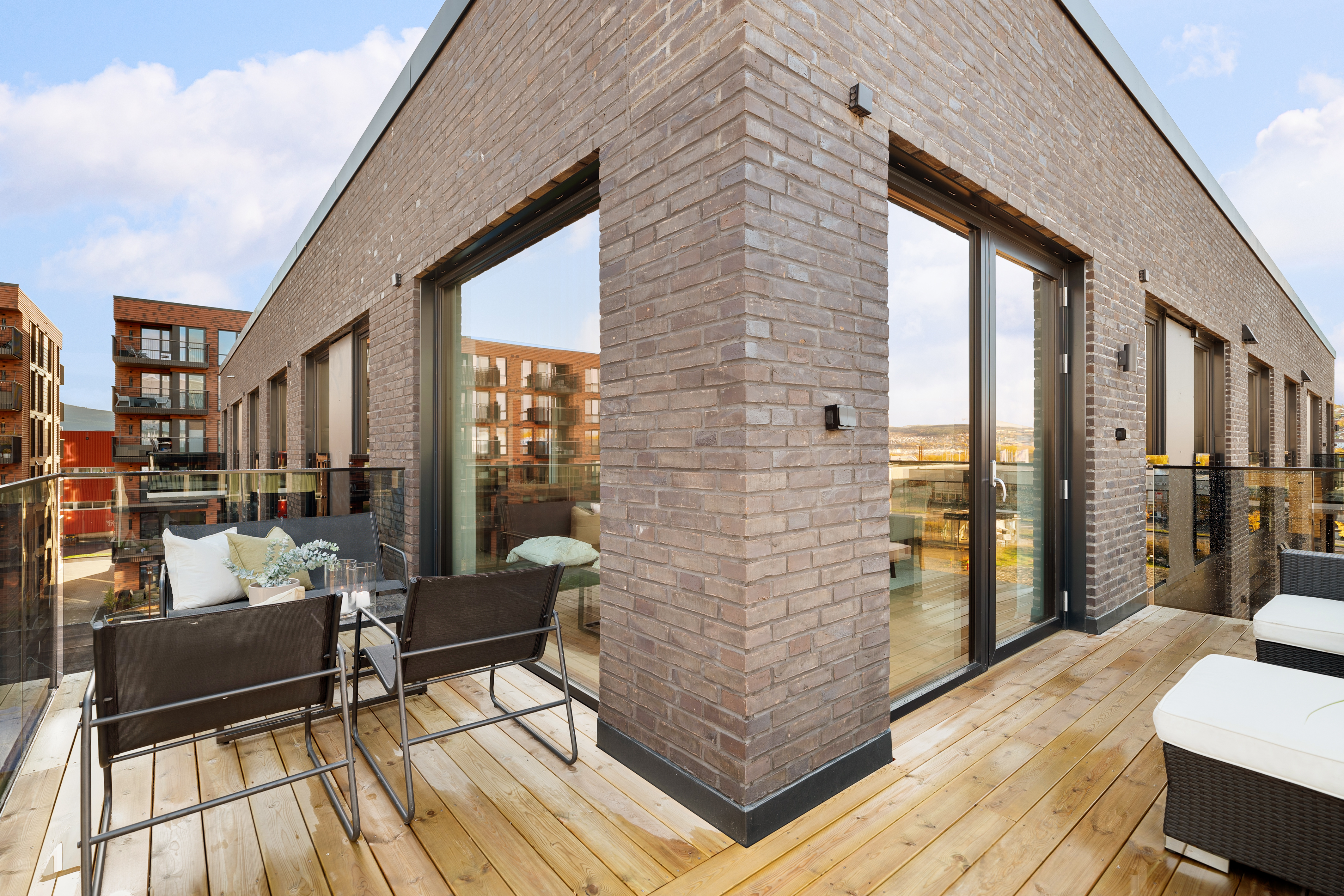 Vi har også bygget fine romslige 5-roms rekkehus i samme standard, med parkering i garasje og fine terrasser mot sørvest.