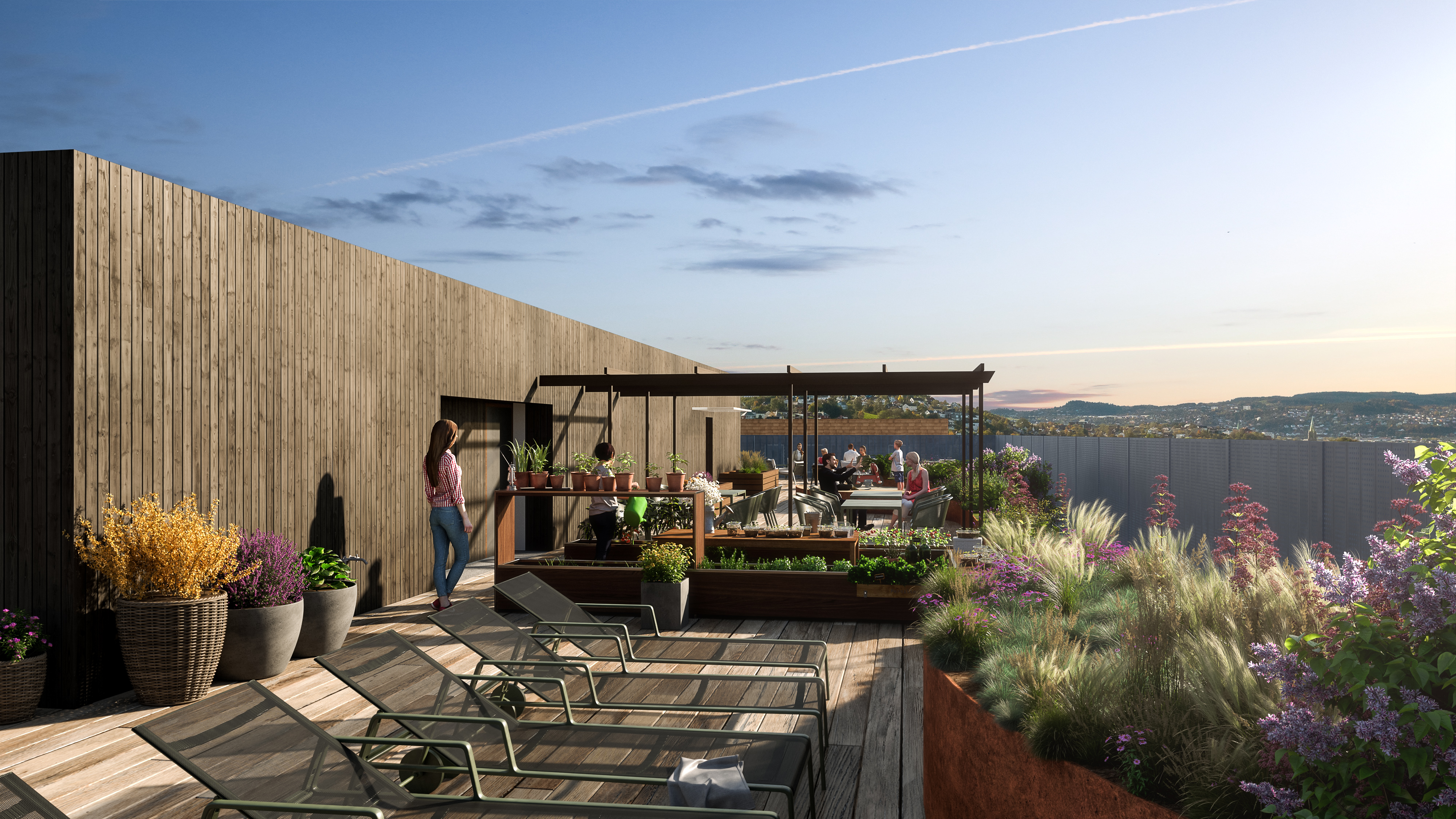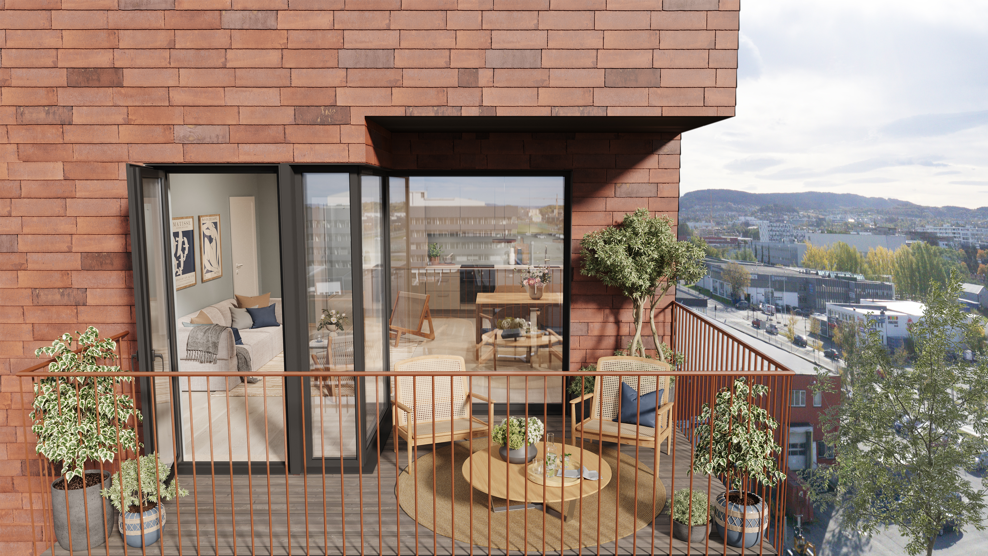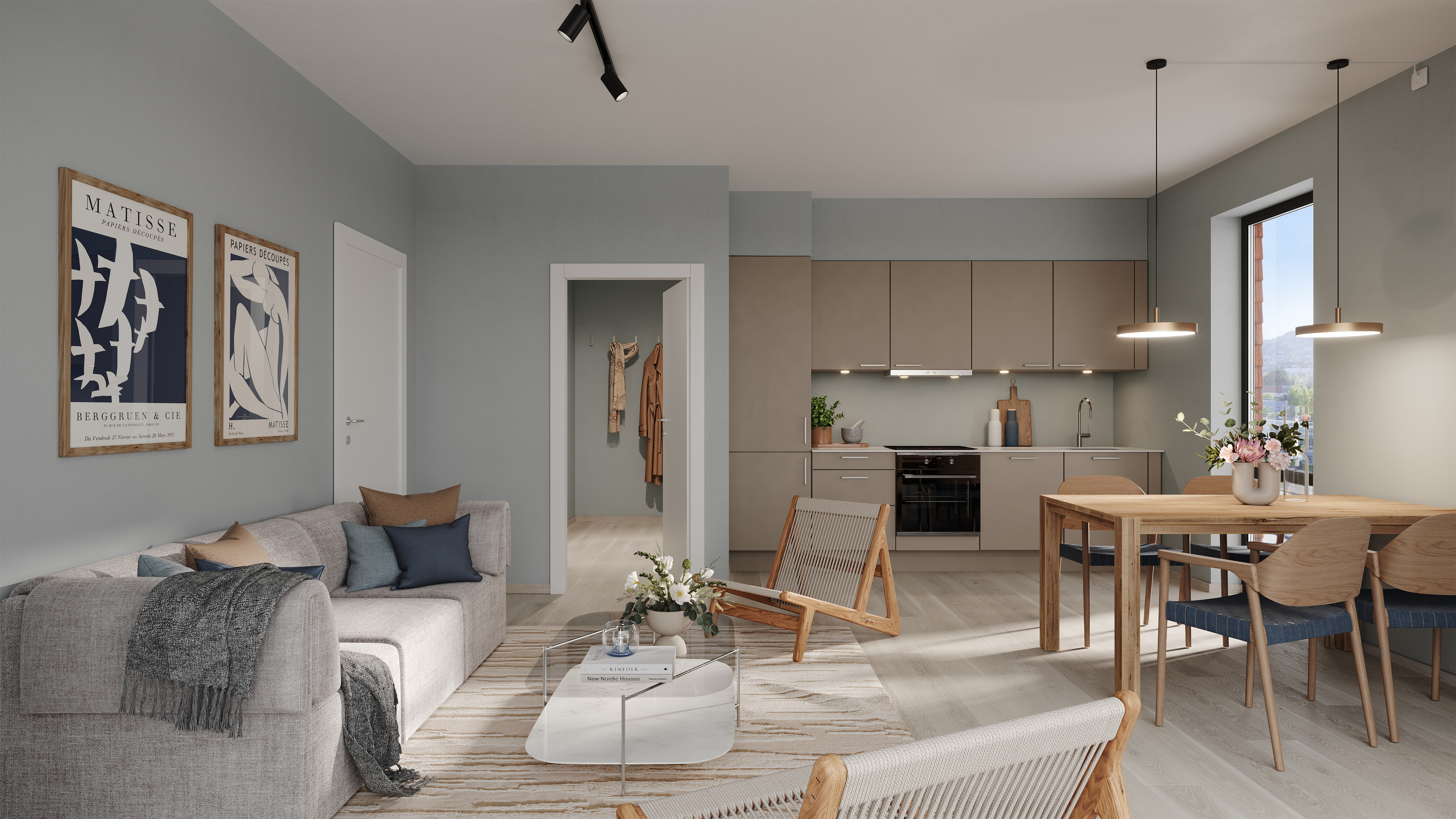 Alle illustrasjoner er utarbeidet basert på tegninger av fremtidige bygg. Illustrerte fasader vil kunne avvike fra ferdige bygg. Elementer og materialer i illustrasjonene kan avvike fra standardleveranse. Øvrige bygg, beplantning, vegetasjon og fellesarealer er ikke endelig prosjektert.