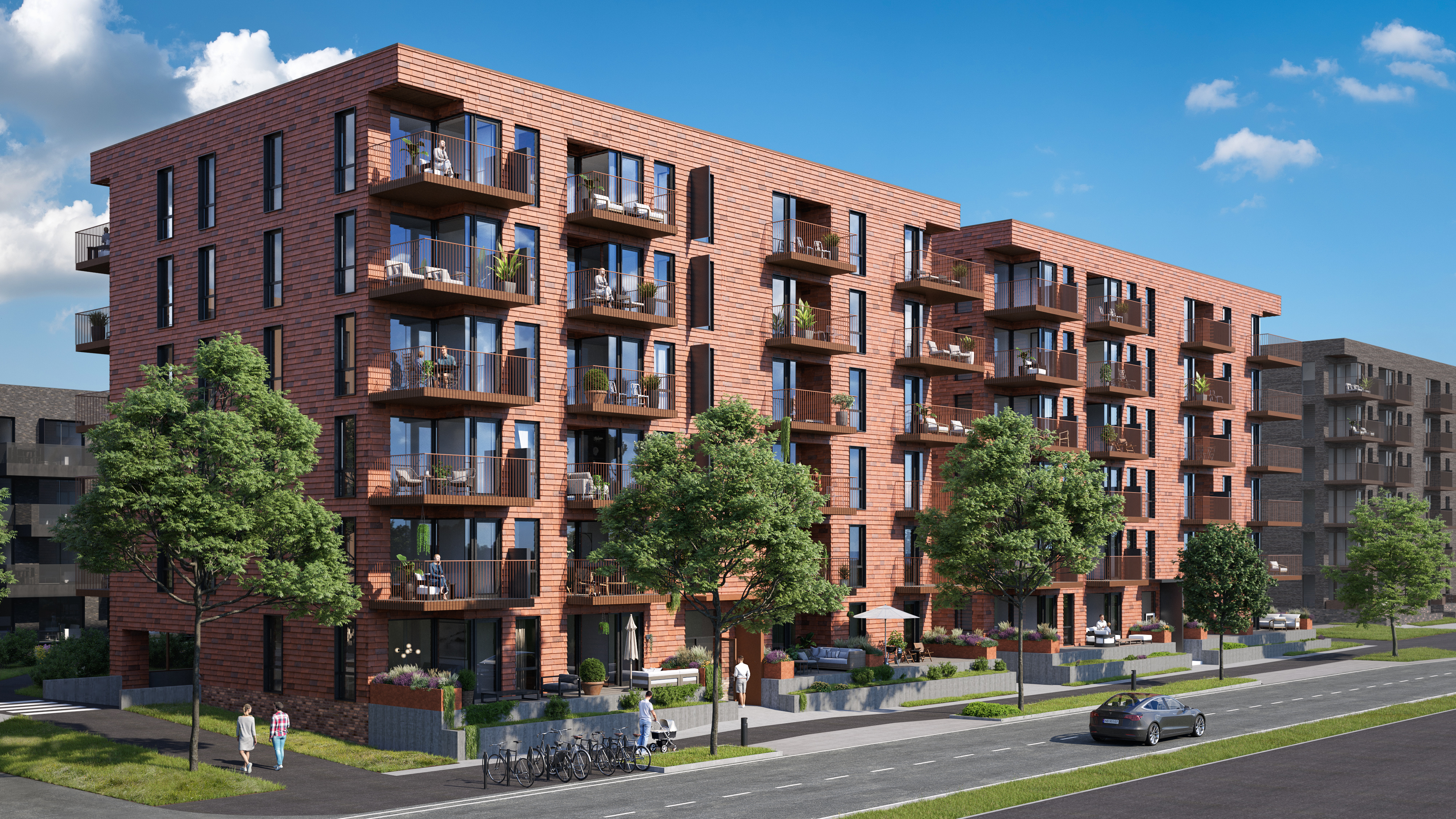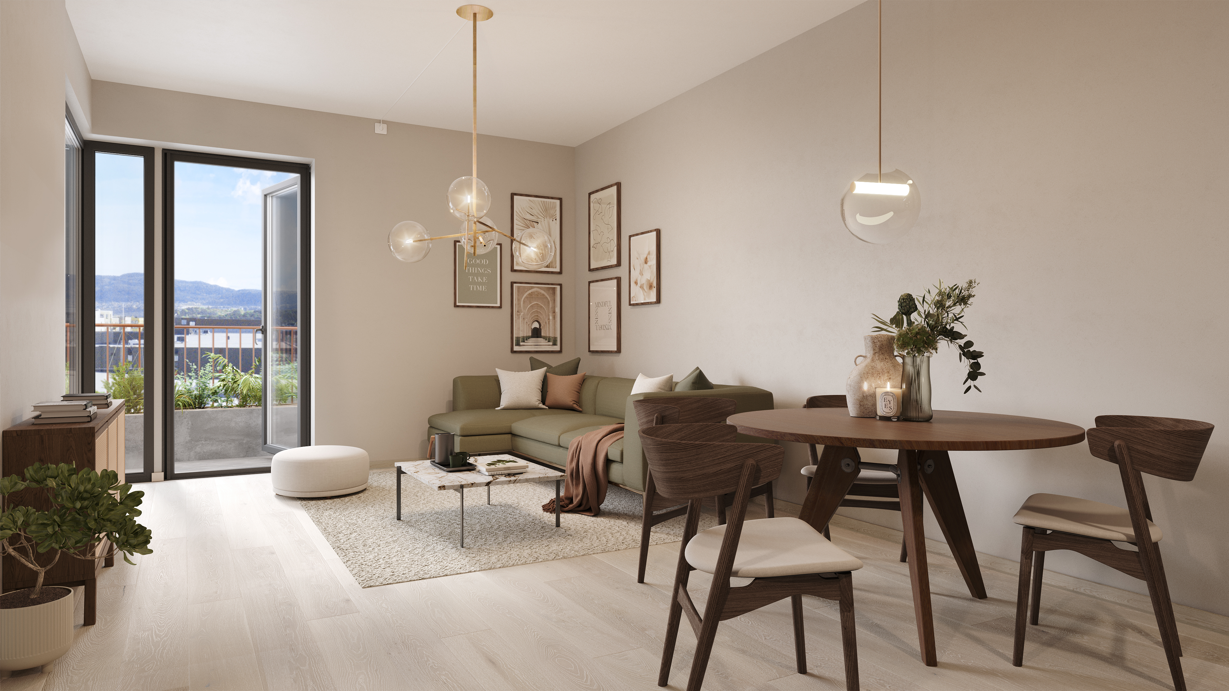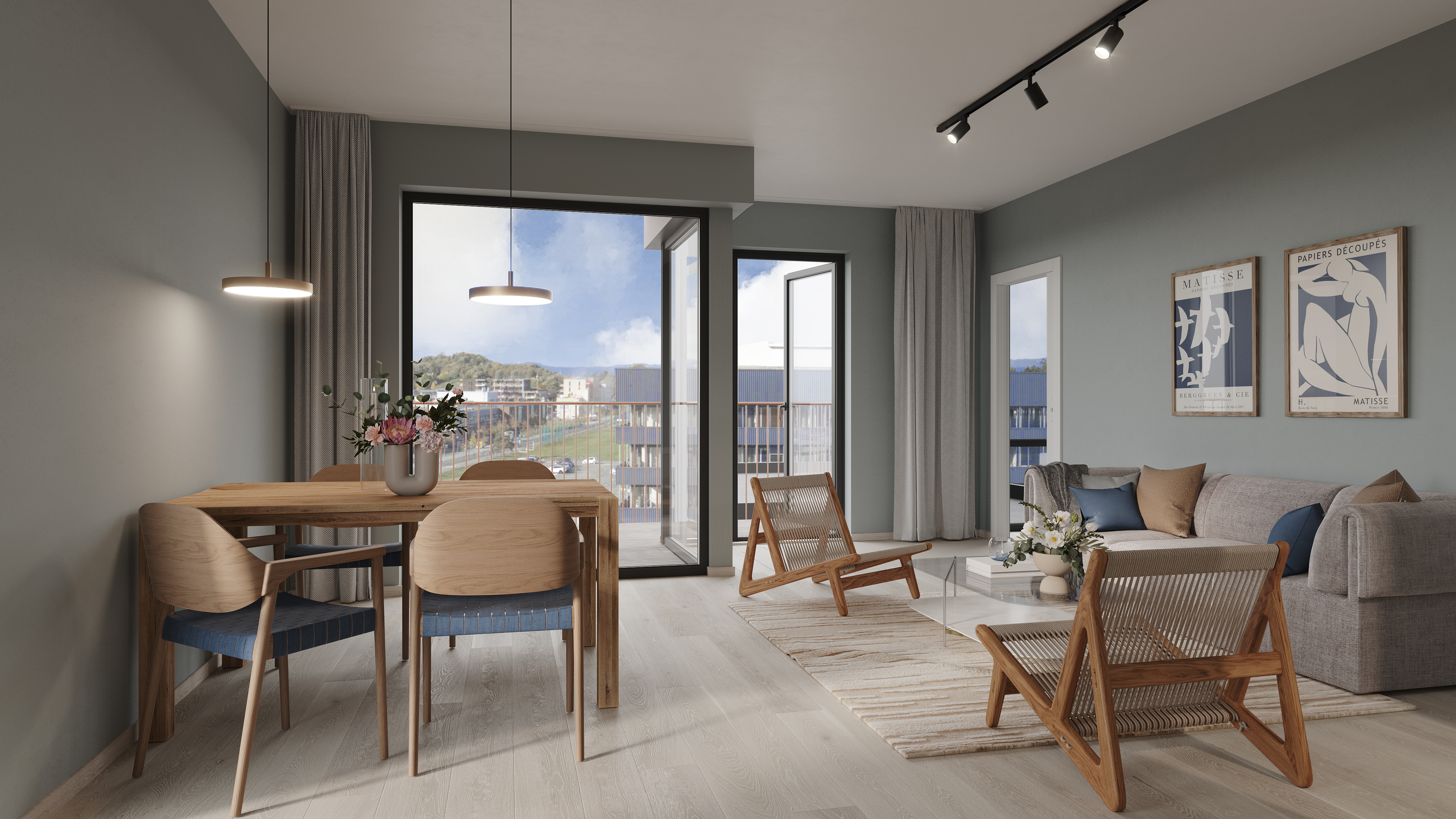Alle illustrasjoner er utarbeidet basert på tegninger av fremtidige bygg. Illustrerte fasader vil kunne avvike fra ferdige bygg. Elementer og materialer i illustrasjonene kan avvike fra standardleveranse. Øvrige bygg, beplantning, vegetasjon og fellesarealer er ikke endelig prosjektert.