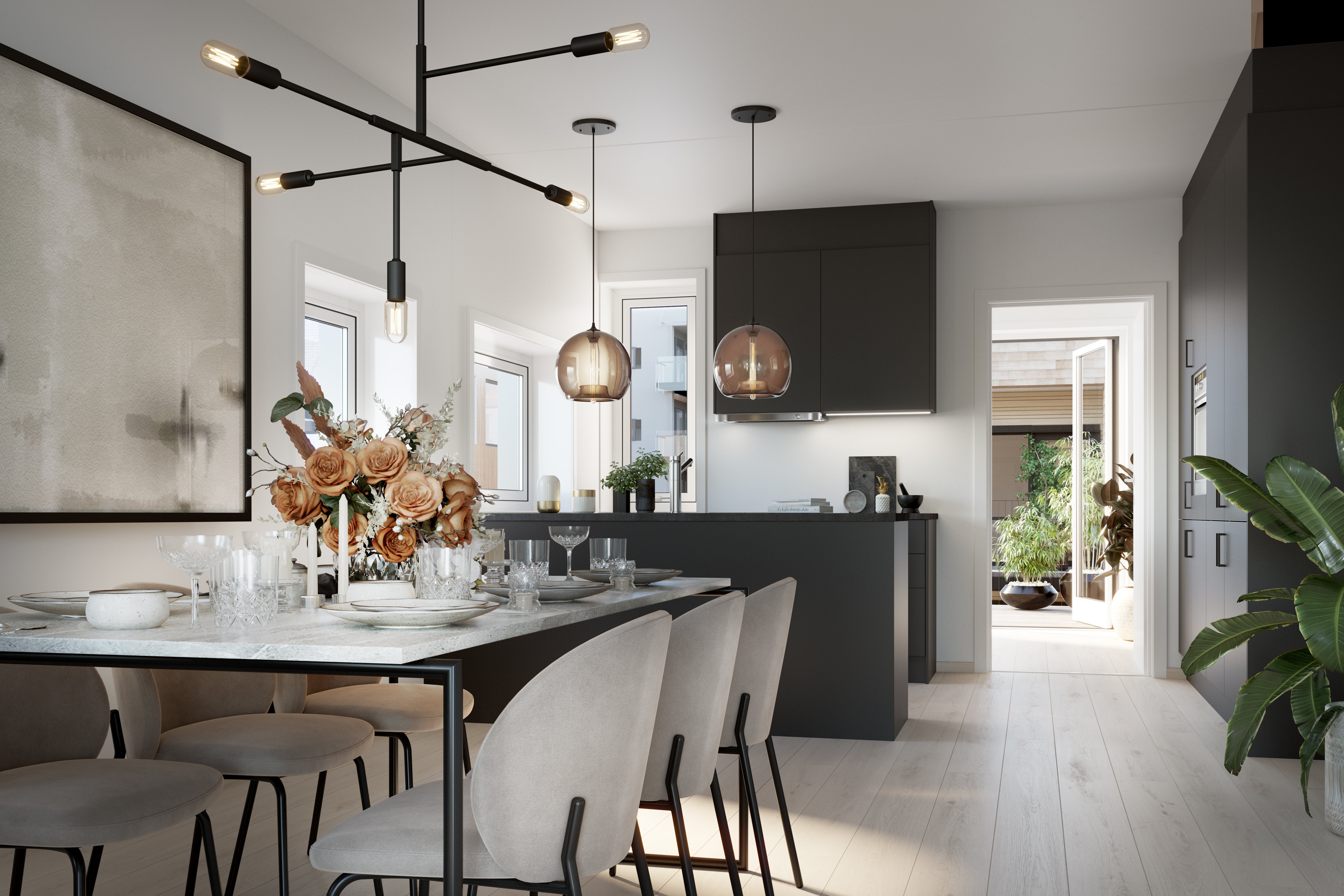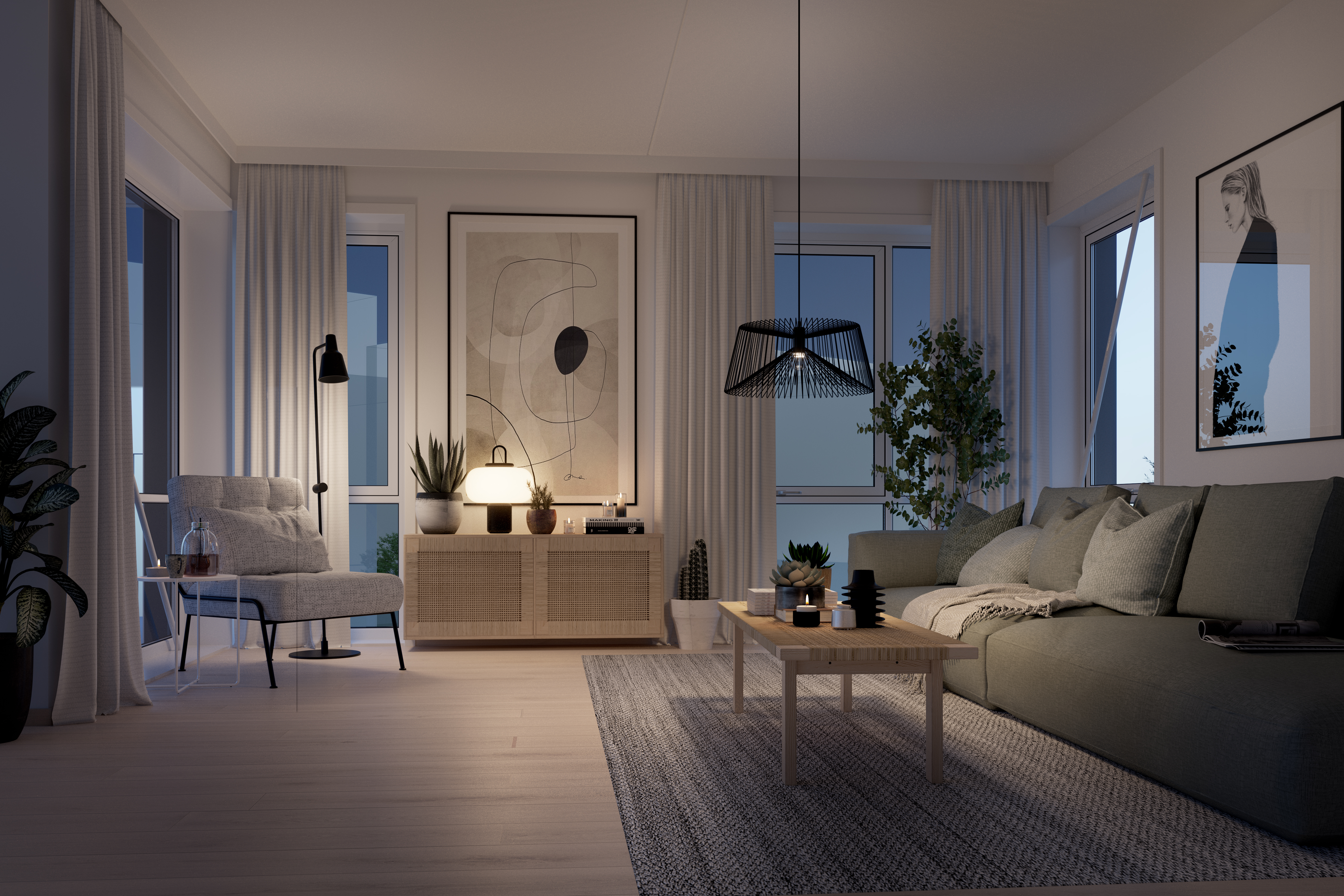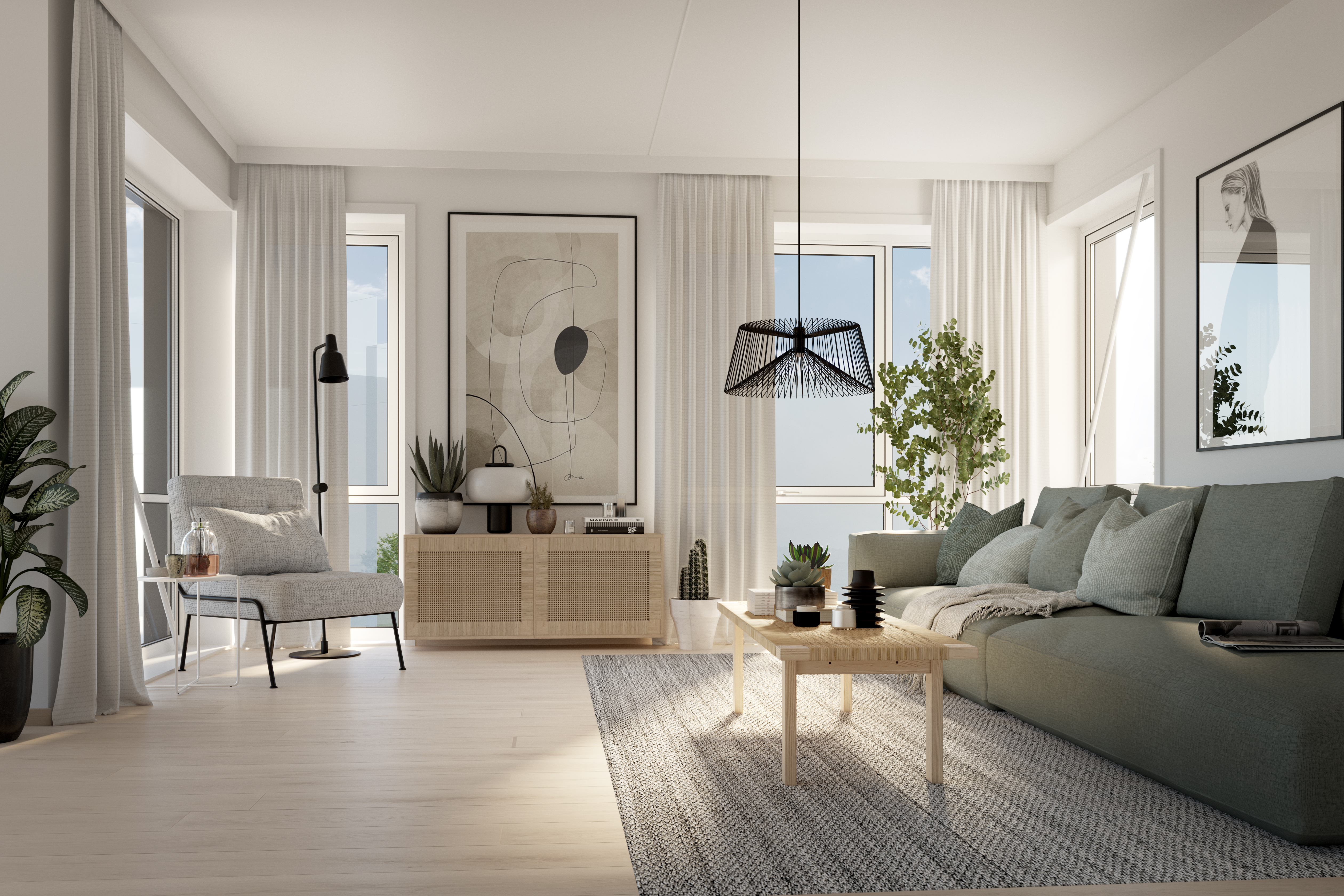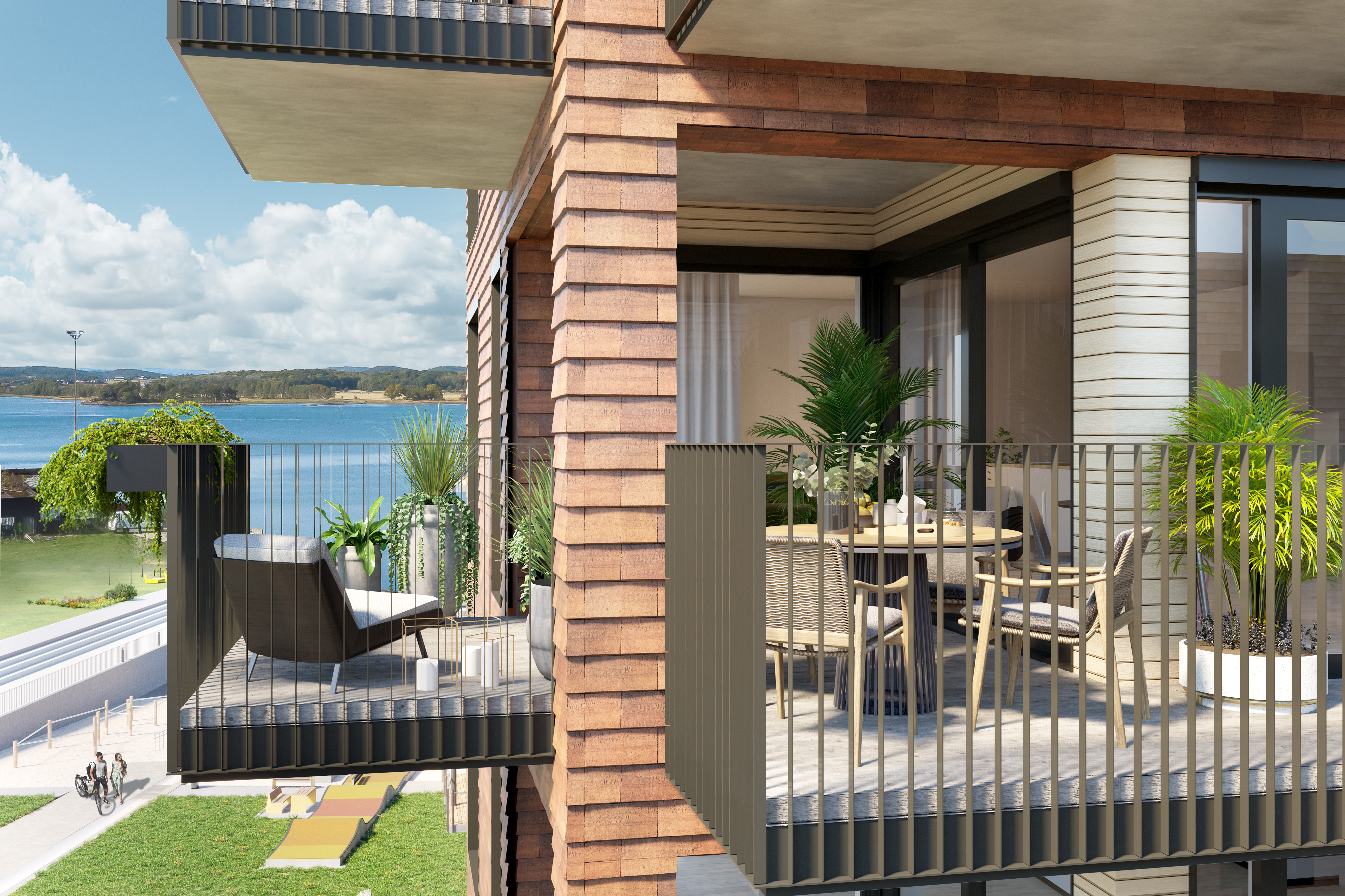 Alle illustrasjoner er utarbeidet basert på tegninger av fremtidige bygg. Illustrerte fasader vil kunne avvike fra ferdige bygg. Elementer og materialer i illustrasjonene kan avvike fra standardleveranse. Øvrige bygg, beplantning, vegetasjon og fellesarealer er ikke endelig prosjektert.