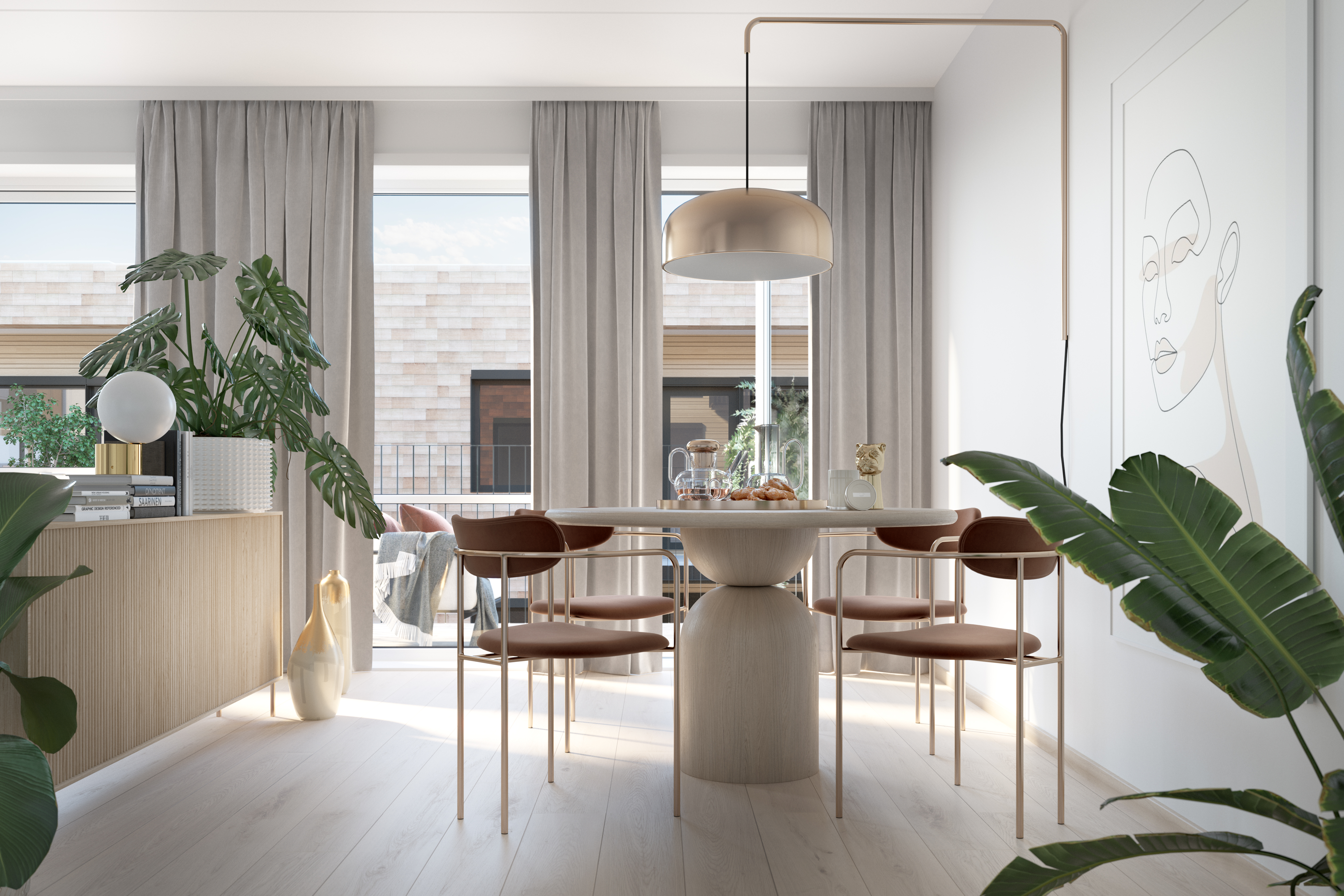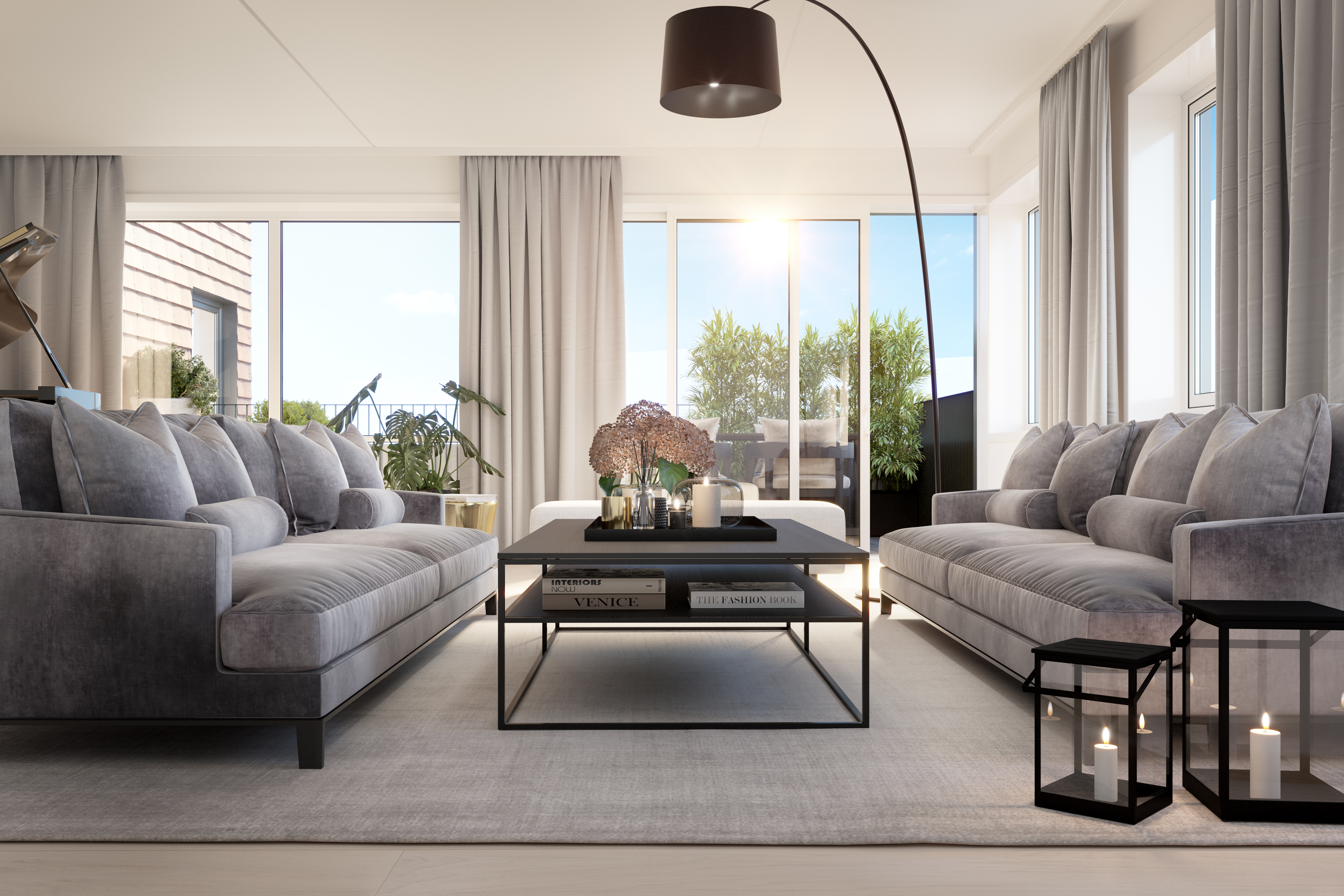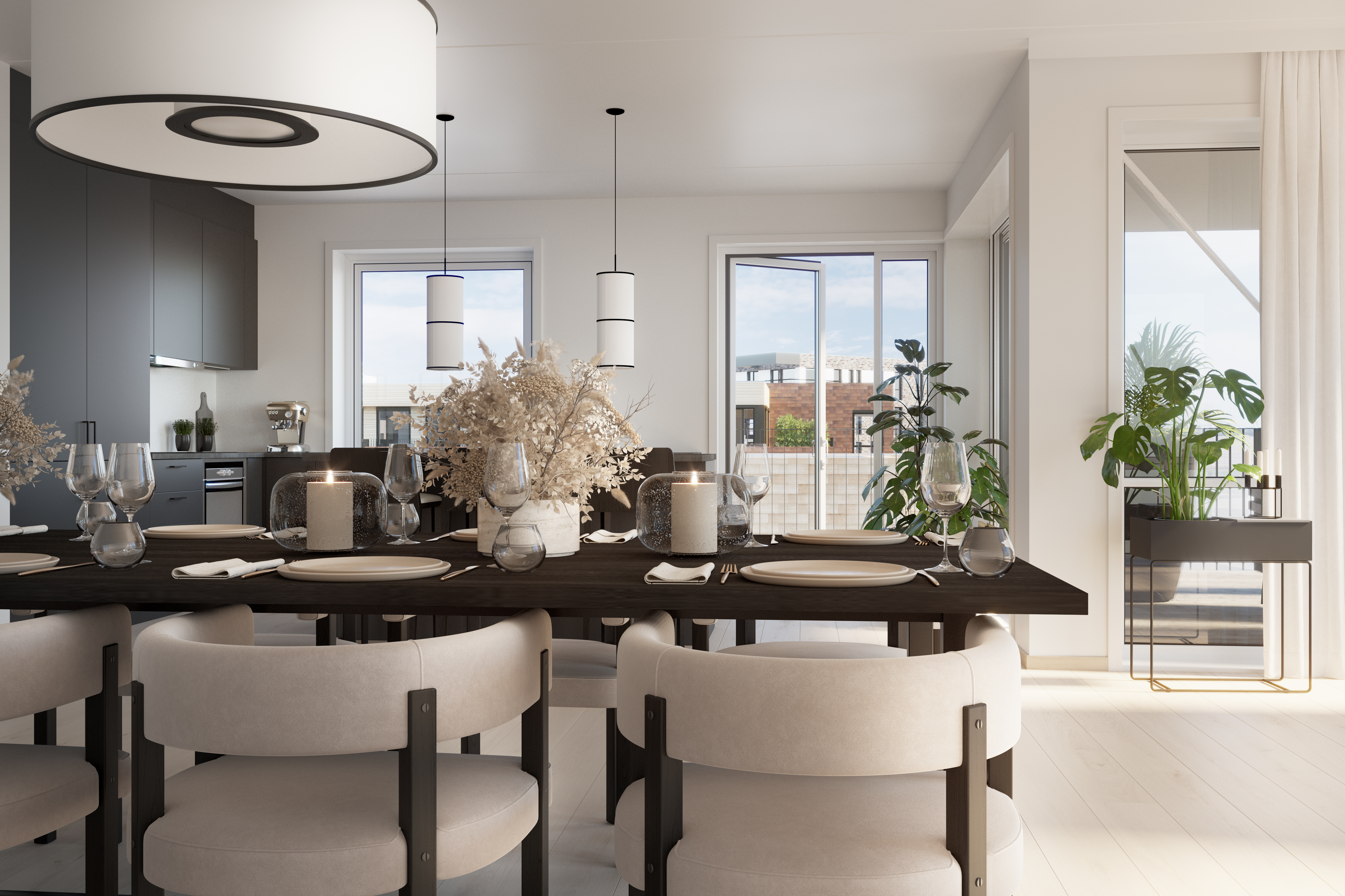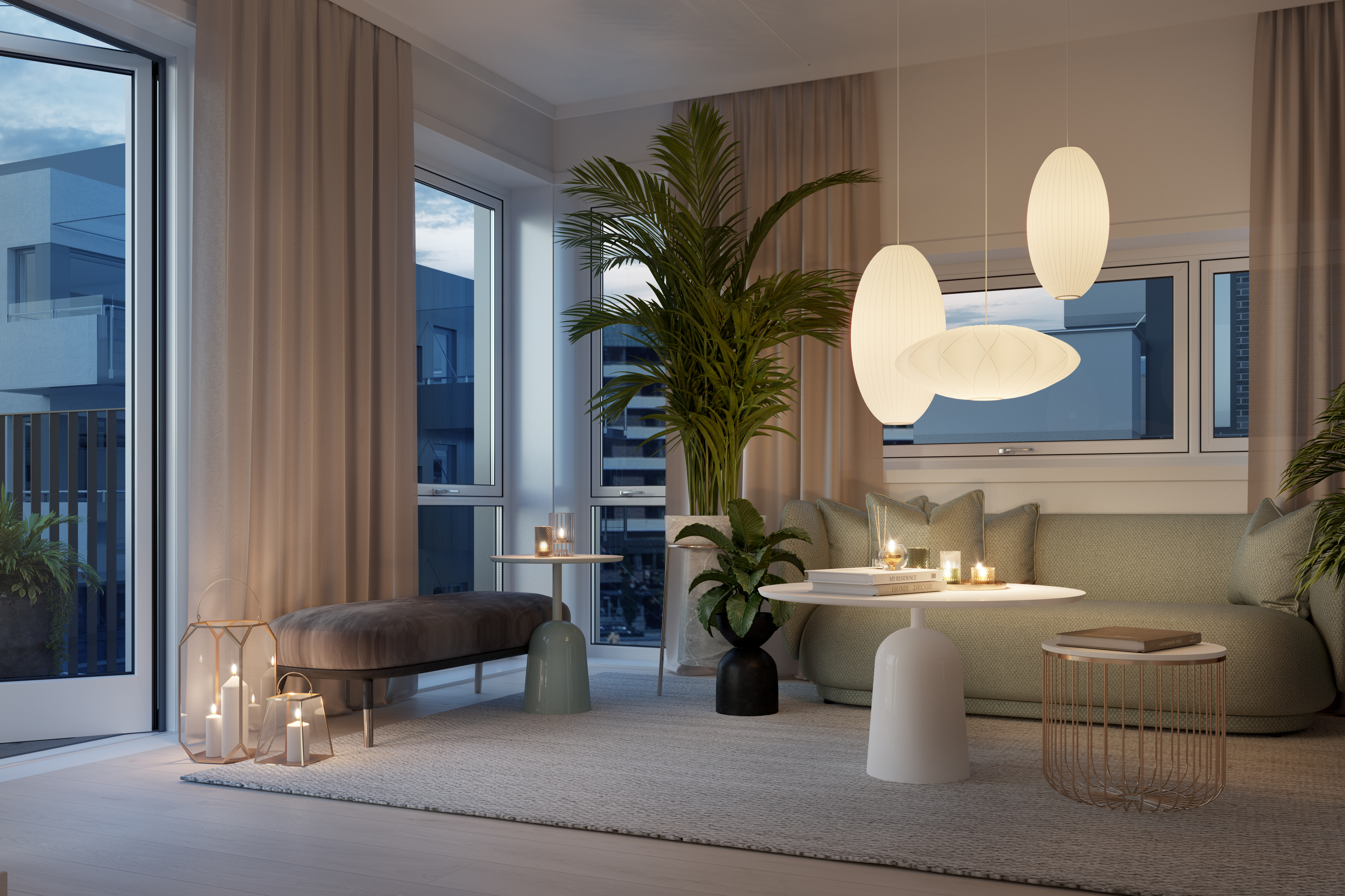 Alle illustrasjoner er utarbeidet basert på tegninger av fremtidige bygg. Illustrerte fasader vil kunne avvike fra ferdige bygg. Elementer og materialer i illustrasjonene kan avvike fra standardleveranse. Øvrige bygg, beplantning, vegetasjon og fellesarealer er ikke endelig prosjektert.