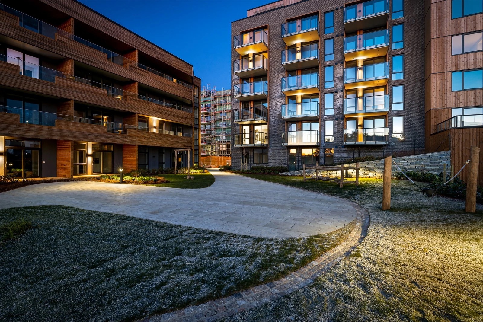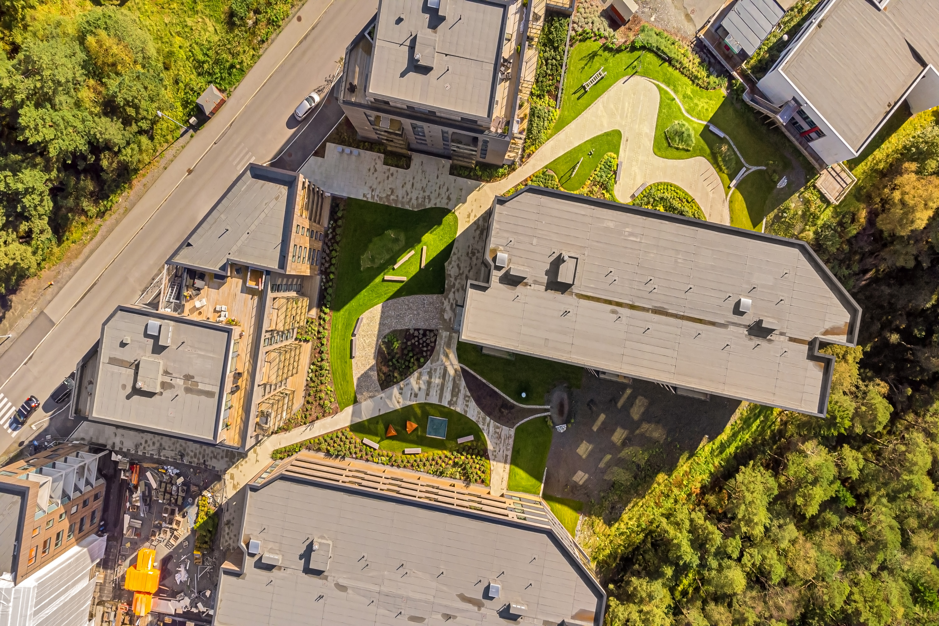 Uteområdene er bilfrie og universelt utformede, med koller, vannspeil, lekeområder og beplantning. I tillegg ligger skogen og vannet helt nær. «Vi planlegger ikke bare for menneskene, men også for dyrene og fuglene som allerede bor her», sier landskapsarkitekt Grete Evenstad.