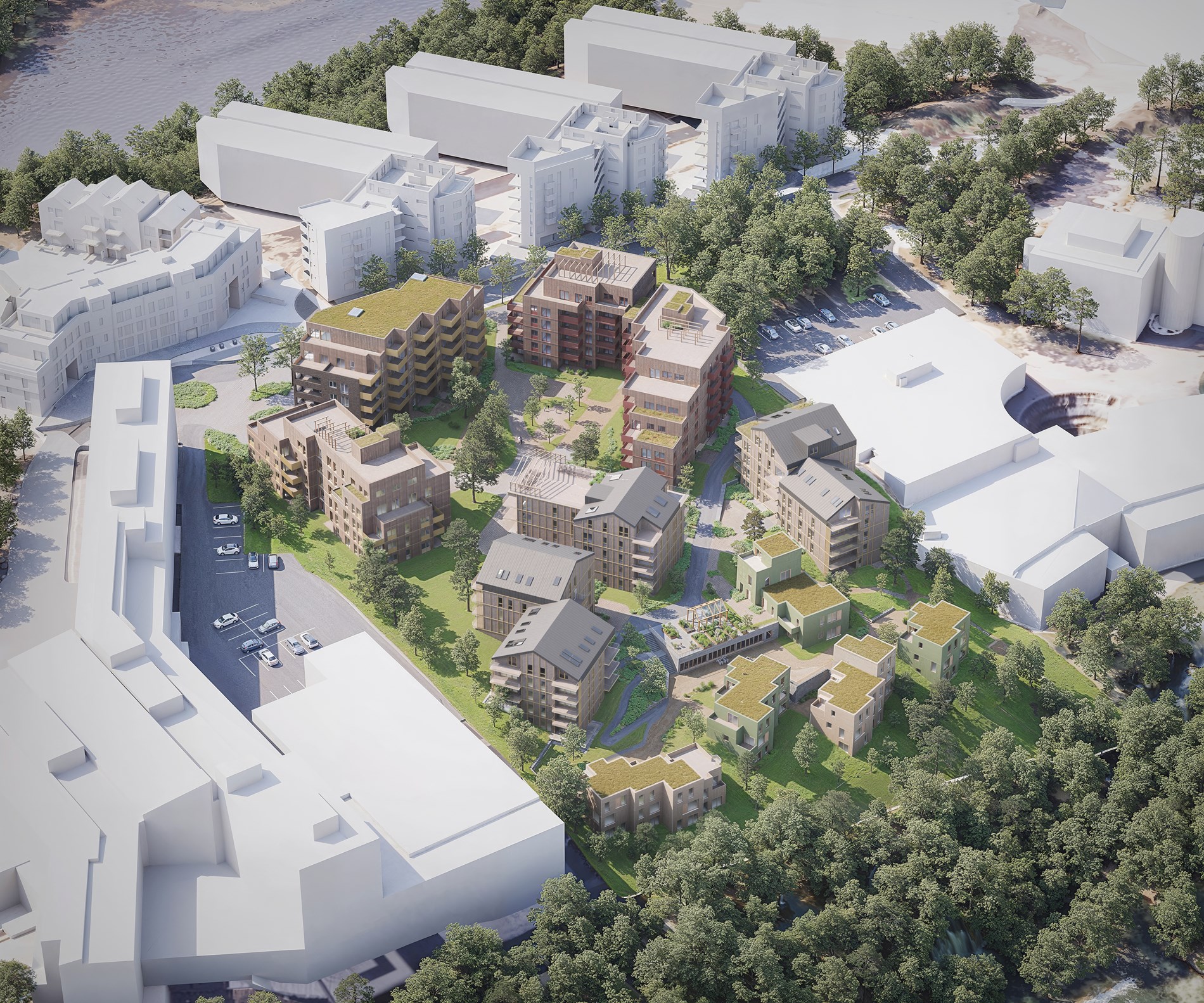 Naboeiendommer vises i enkelte illustrasjoner. Dette er for å vise prosjektets beliggenhet i forhold til eksisterende bygninger. Avvik kan forekomme.