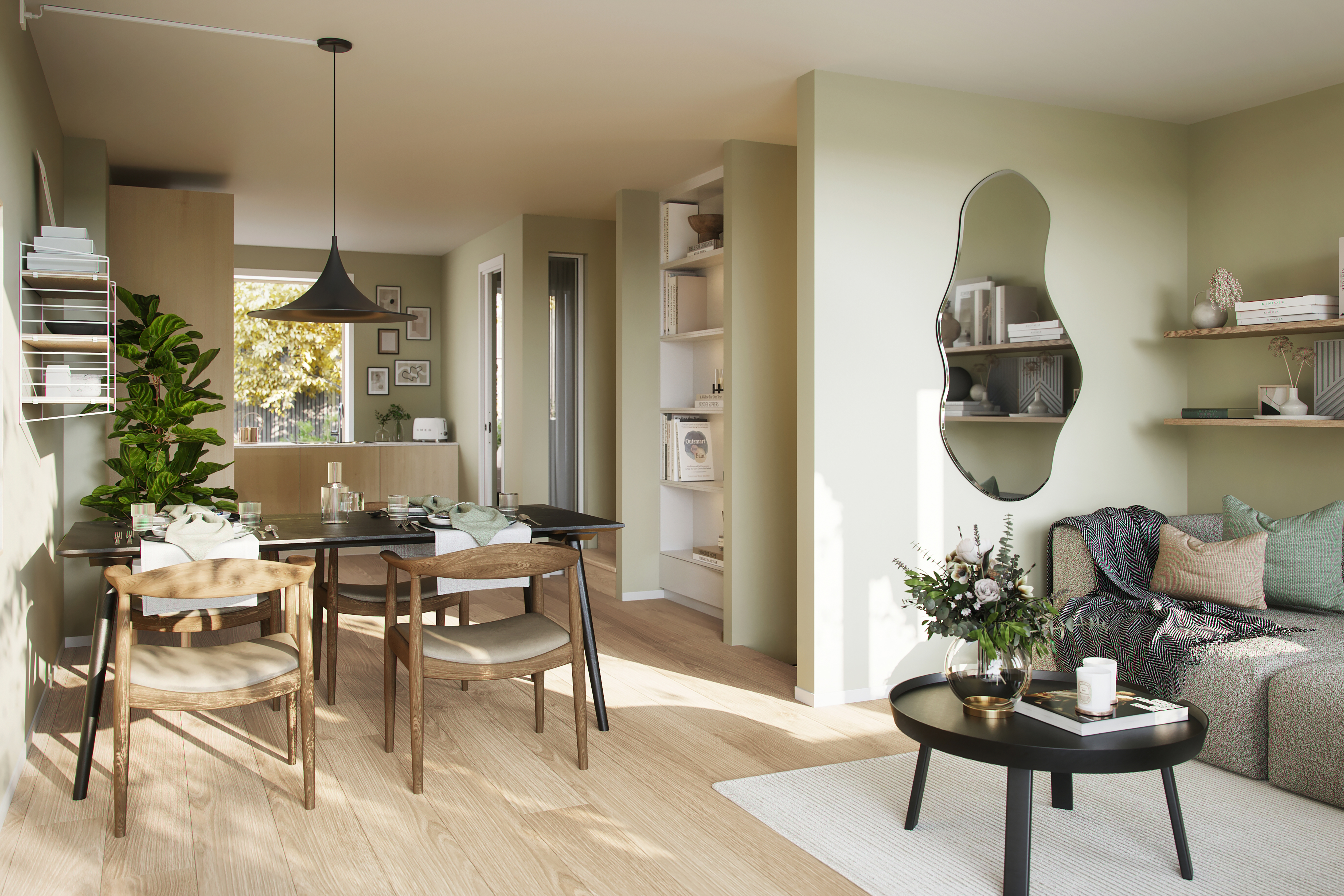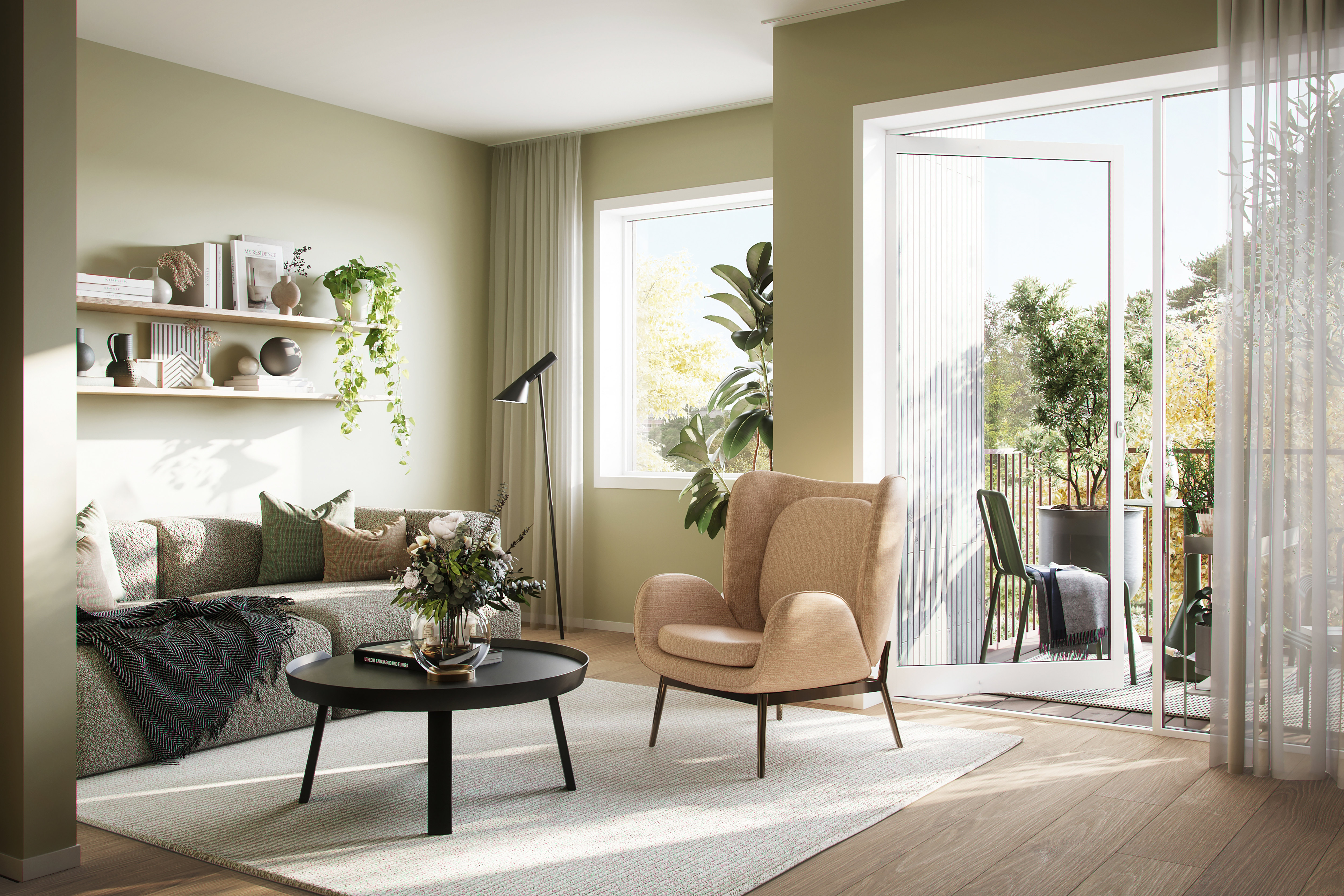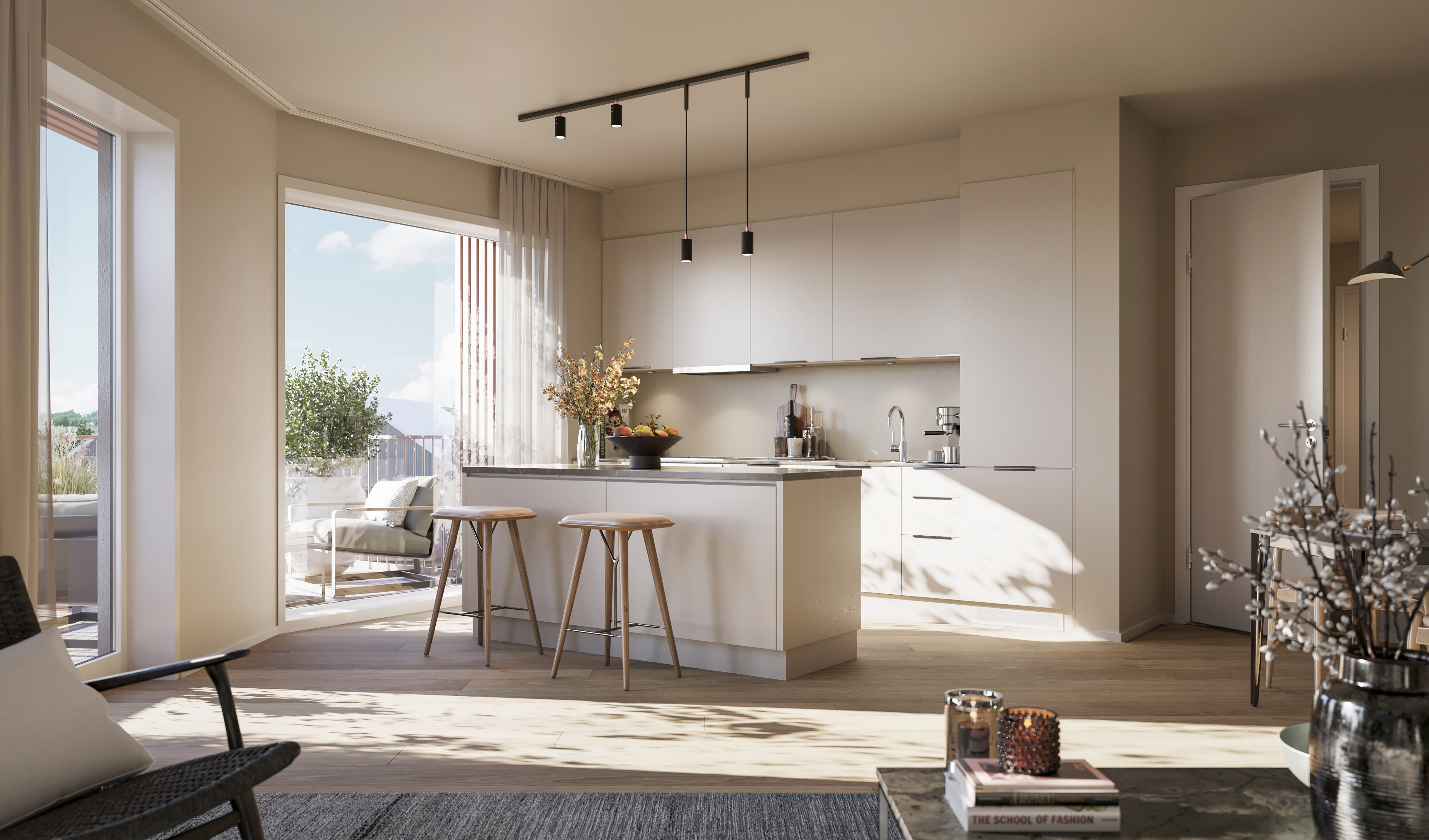 Alle illustrasjoner er utarbeidet basert på tegninger av fremtidige bygg. Illustrerte fasader vil kunne avvike fra ferdige bygg. Elementer og materialer i illustrasjonene kan avvike fra standardleveranse. Øvrige bygg, beplantning, vegetasjon og fellesarealer er ikke endelig prosjektert.